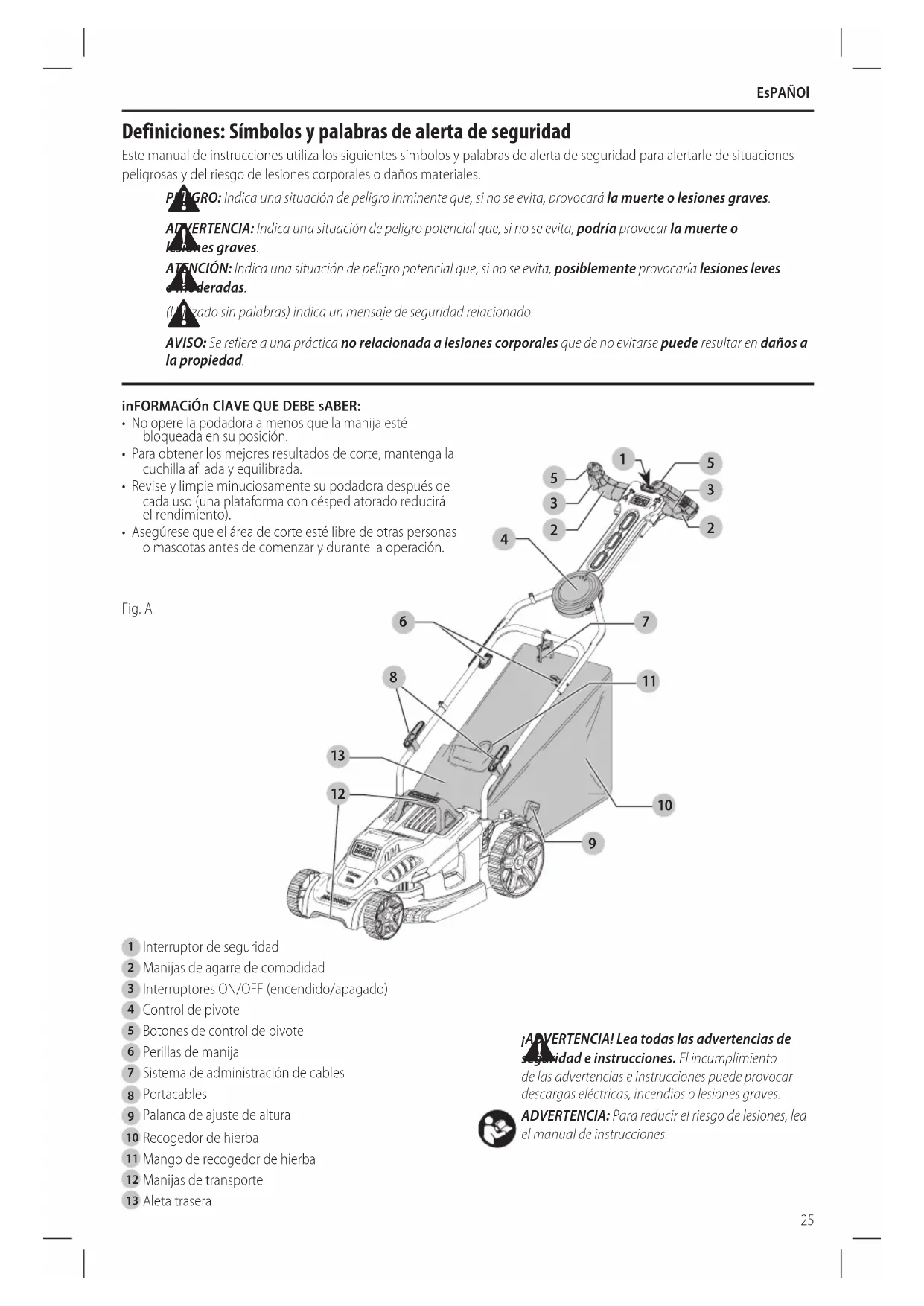 ¡ADVERTENCIA! Lea todas las advertencias de seguridad e instrucciones. El incumplimiento de las advertencias e instrucciones puede provocar descargas eléctricas, incendios o lesionesgraves. ADVERTENCIA: Para reducir el riesgo de lesiones, lea el manual deinstrucciones.