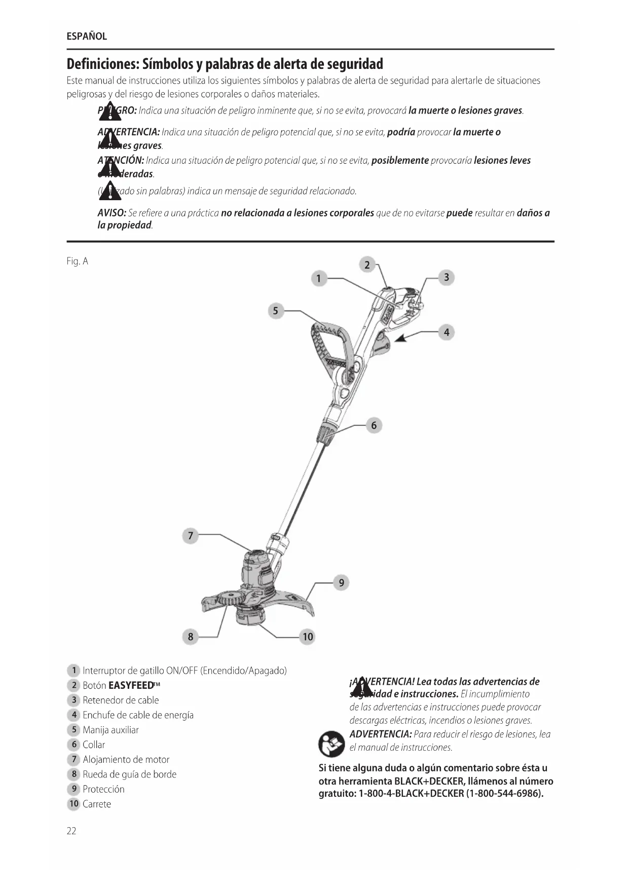 Motor Asegúrese de que la fuente de energía concuerde con lo que se indica en la placa. Un descenso en el voltaje de más del 10% producirá una pérdida de potencia y sobrecalentamiento. Todas las herramientas BLACK+DECKER son probadas en fábrica; si esta herramienta no funciona, verifique el suministro eléctrico. COMPONENTES (FIG. A)