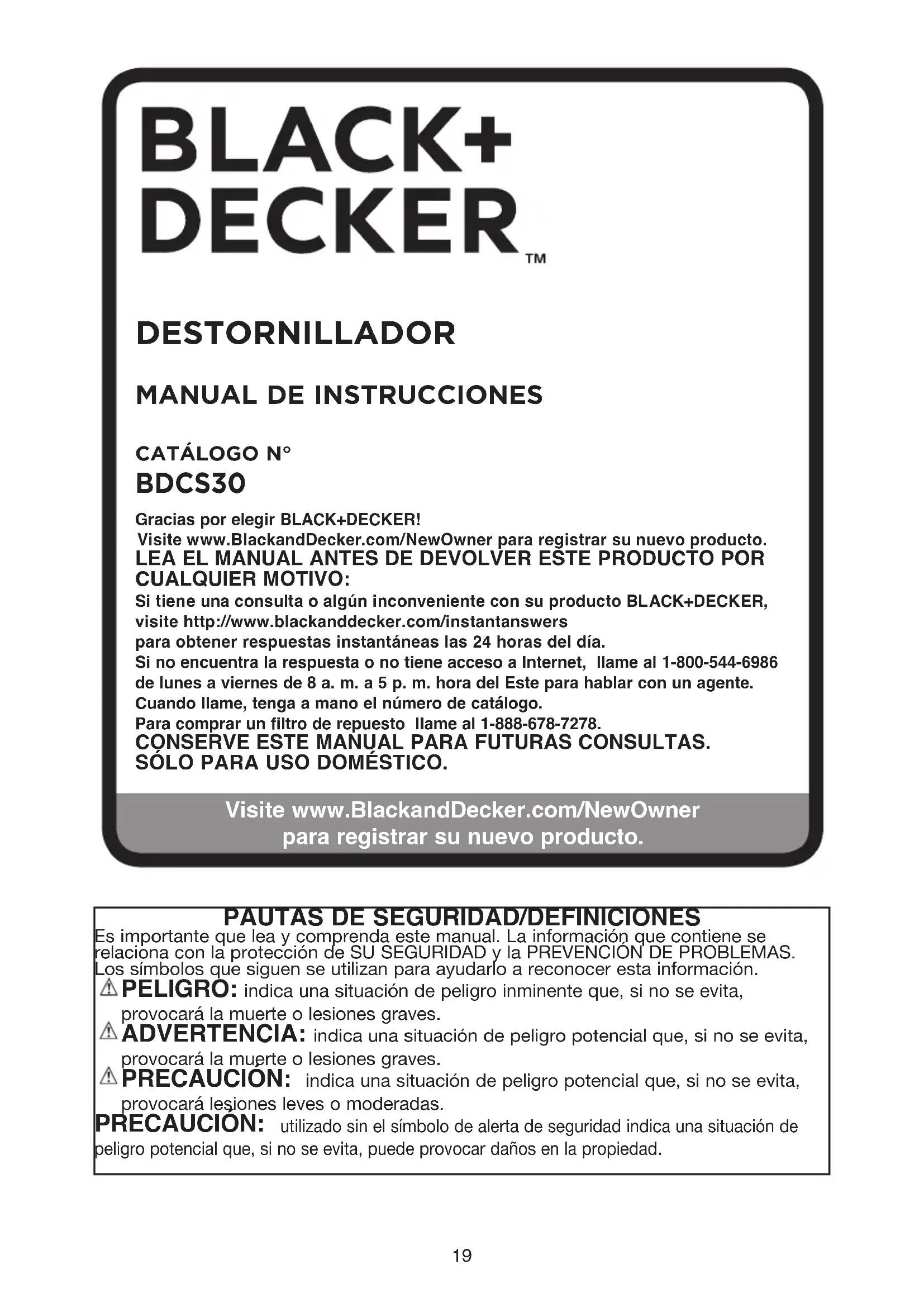 DESTORNILLADOR Gracias por elegir BLACK+DECKER! Visite www.BlackandDecker.com/NewOwner para registrar su nuevo producto. LEA EL MANUAL ANTES DE DEVOLVER ESTE PRODUCTO POR CUALQUIER MOTIVO: Si tiene una consulta o algún inconveniente con su producto BLACK+DECKER, visite http://www.blackanddecker.com/instantanswers para obtener respuestas instantáneas las 24 horas del día.Si no encuentra la respuesta o no tiene acceso a Internet, llame al 1-800-544-6986 de lunes a viernes de 8 a. m. a 5 p. m. hora del Este para hablar con un agente. Cuando llame, tenga a mano el número de catálogo.Para comprar un filtro de repuesto llame al 1-888-678-7278.CONSERVE ESTE MANUAL PARA FUTURAS CONSULTAS.SÓLO PARA USO DOMÉSTICO.CATÁLOGO N° BDCS30