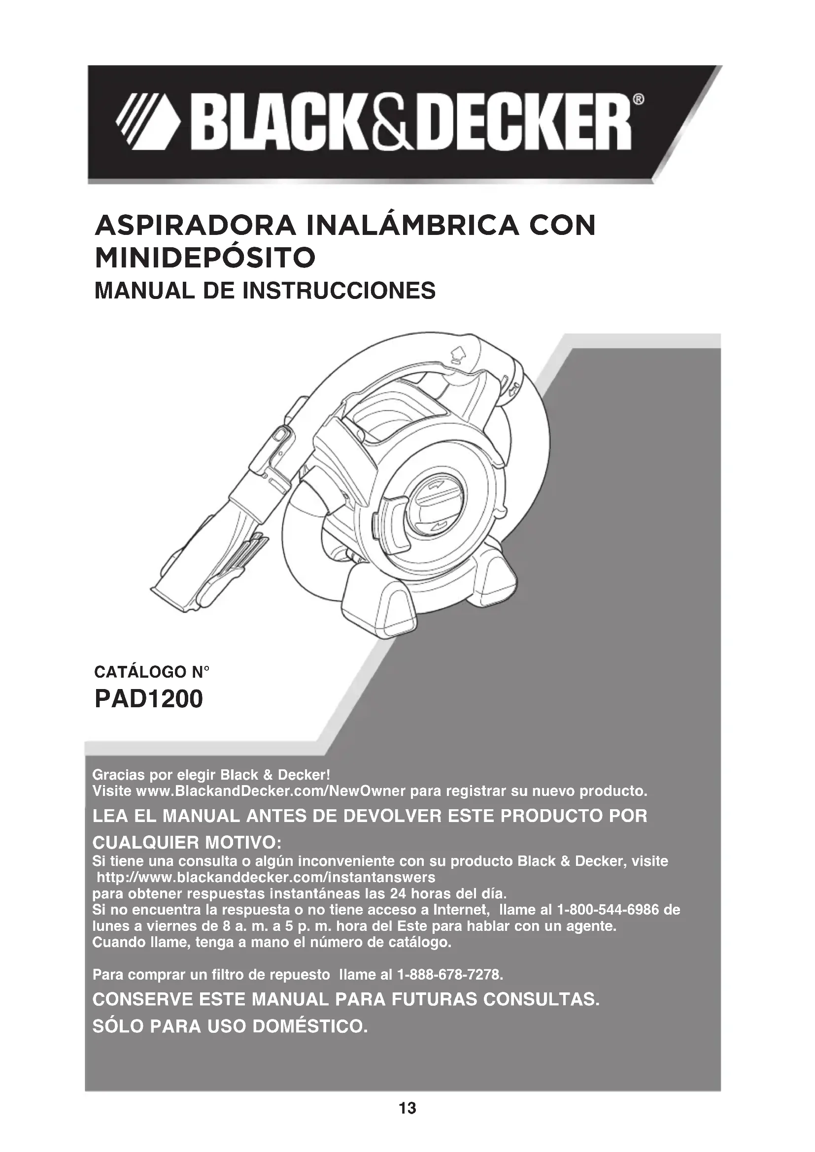 aspiradora inalámbrica con minidepósito Gracias por elegir Black & Decker! Visite www.BlackandDecker.com/NewOwner para registrar su nuevo producto. LEA EL MANUAL ANTES DE DEVOLVER ESTE PRODUCTO POR CUALQUIER MOTIVO: Si tiene una consulta o algún inconveniente con su producto Black & Decker, visite http://www.blackanddecker.com/instantanswers para obtener respuestas instantáneas las 24 horas del día.Si no encuentra la respuesta o no tiene acceso a Internet, llame al 1-800-544-6986 de lunes a viernes de 8 a. m. a 5 p. m. hora del Este para hablar con un agente. Cuando llame, tenga a mano el número de catálogo.Para comprar un filtro de repuesto llame al 1-888-678-7278. CONSERVE ESTE MANUAL PARA FUTURAS CONSULTAS.