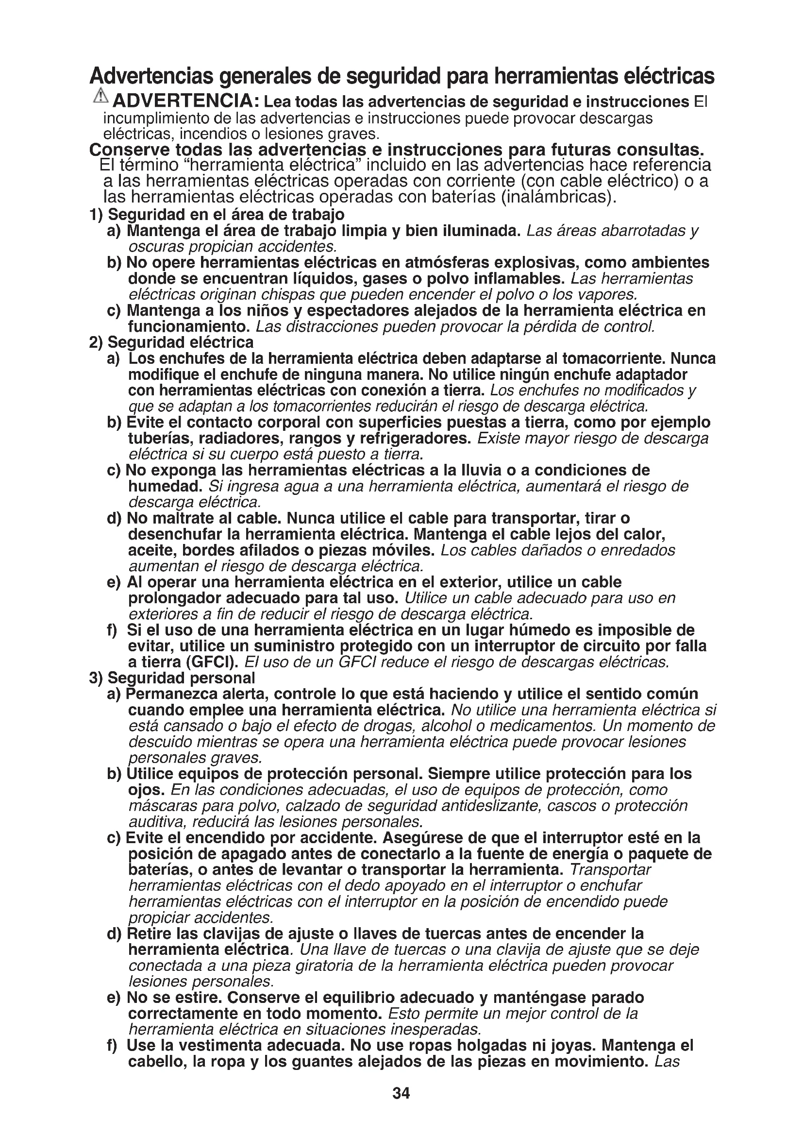 Advertencias generales de seguridad para herramientas eléctricas ADVERTENCIA: Lea todas las advertencias de seguridad e instrucciones El incumplimiento de las advertencias e instrucciones puede provocar descargas eléctricas, incendios o lesiones graves. Conserve todas las advertencias e instrucciones para futuras consultas. El término “herramienta eléctrica” incluido en las advertencias hace referencia a las herramientas eléctricas operadas con corriente (con cable eléctrico) o a las herramientas eléctricas operadas con baterías (inalámbricas).