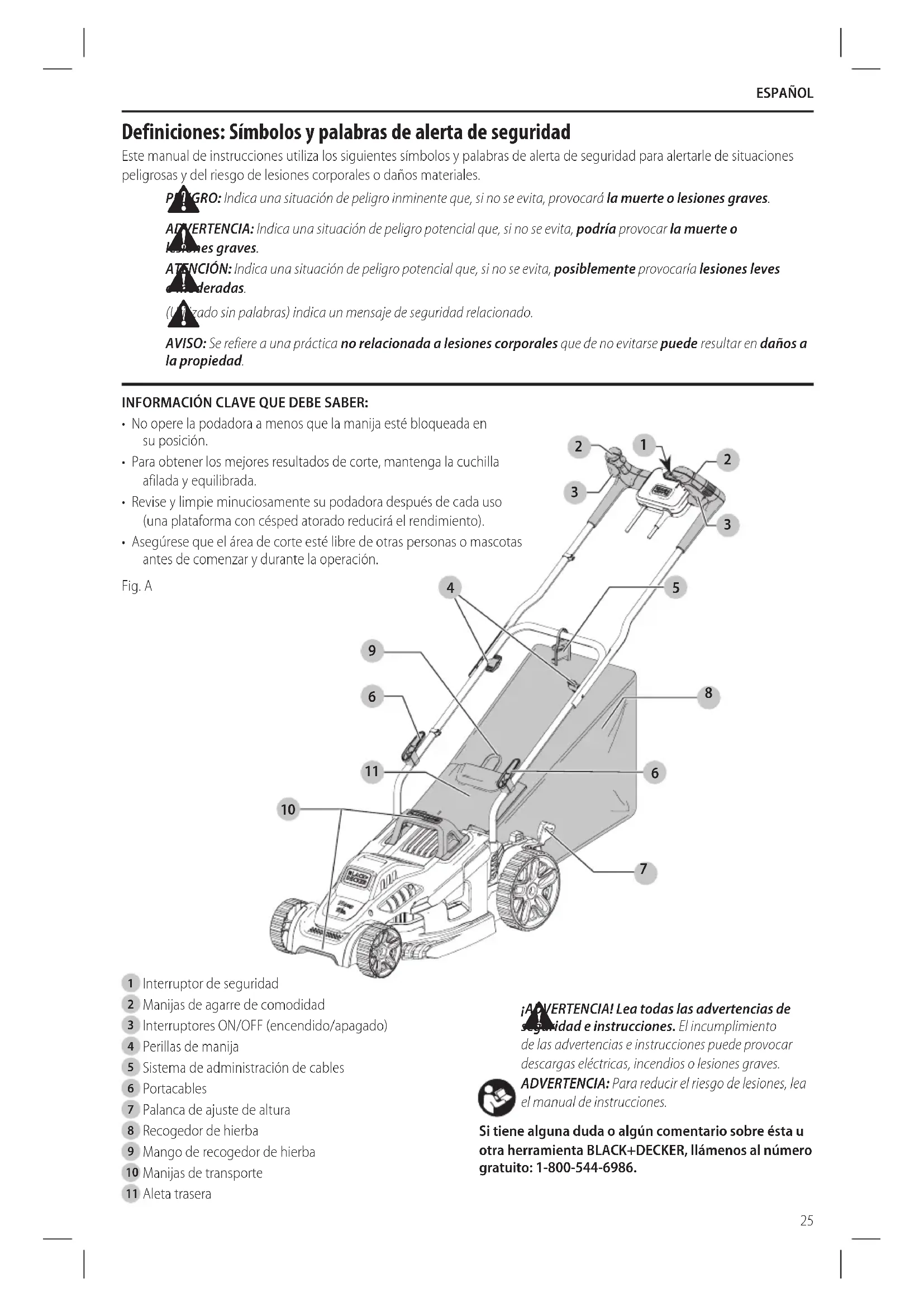 ¡ADVERTENCIA! Lea todas las advertencias de seguridad e instrucciones. El incumplimiento de las advertencias e instrucciones puede provocar descargas eléctricas, incendios o lesionesgraves. ADVERTENCIA: Para reducir el riesgo de lesiones, lea el manual deinstrucciones. Si tiene alguna duda o algún comentario sobre ésta u otra herramienta BLACK+DECKER, llámenos al número gratuito: 1-800-544-6986.