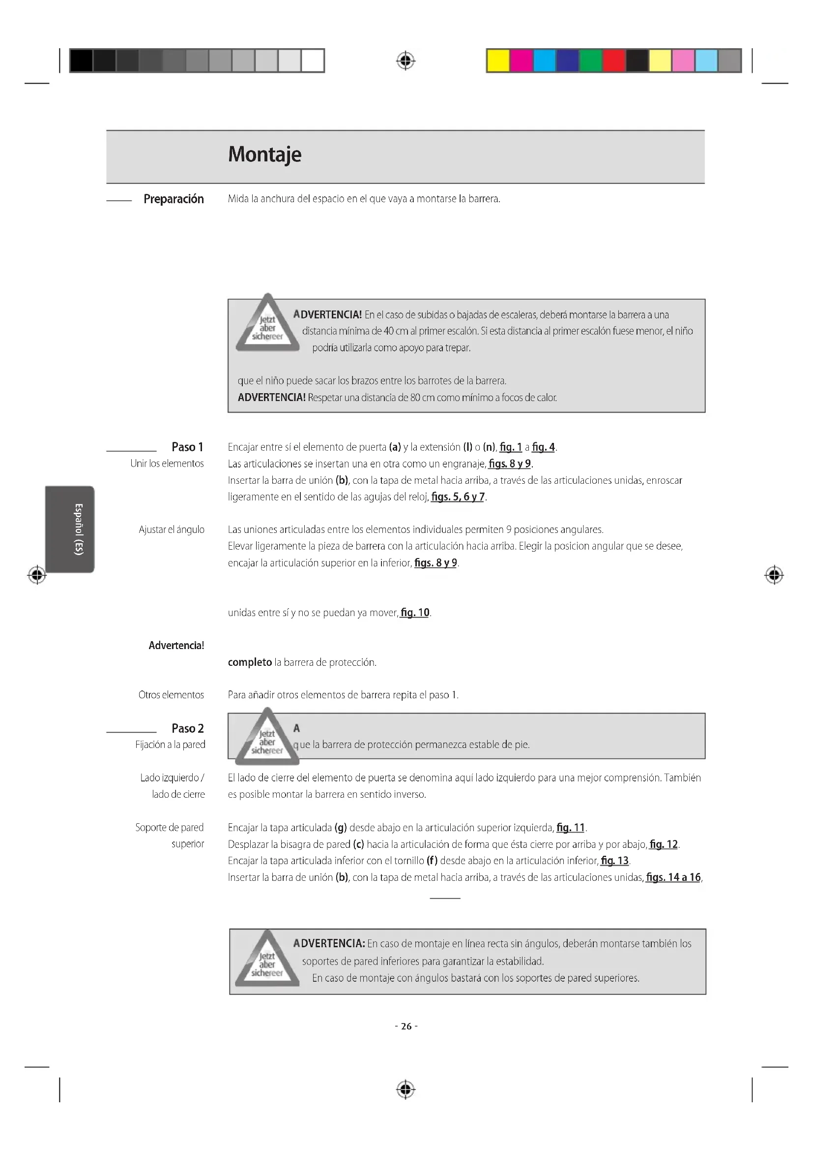 ADVERTENCIA! En el caso de subidas o bajadas de escaleras, deberá montarse la barrera a una distancia mínima de 40 cm al primer escalón. Si esta distancia al primer escalón fuese menor, el niño podría utilizarla como apoyo para trepar. ADVERTENCIA! que el niño puede sacar los brazos entre los barrotes de la barrera. ADVERTENCIA! Respetar una distancia de 80 cm como mínimo a focos de calor. Encajar entre sí el elemento de puerta (a) y la extensión (l) o (n), fig. 1 a fig. 4. Las articulaciones se insertan una en otra como un engranaje, figs. 8 y 9. Insertar la barra de unión (b), con la tapa de metal hacia arriba, a través de las articulaciones unidas, enroscar ligeramente en el sentido de las agujas del reloj, figs. 5, 6 y 7. Las uniones articuladas entre los elementos individuales permiten 9 posiciones angulares. Elevar ligeramente la pieza de barrera con la articulación hacia arriba. Elegir la posicion angular que se desee, encajar la articulación superior en la inferior, figs. 8 y 9.