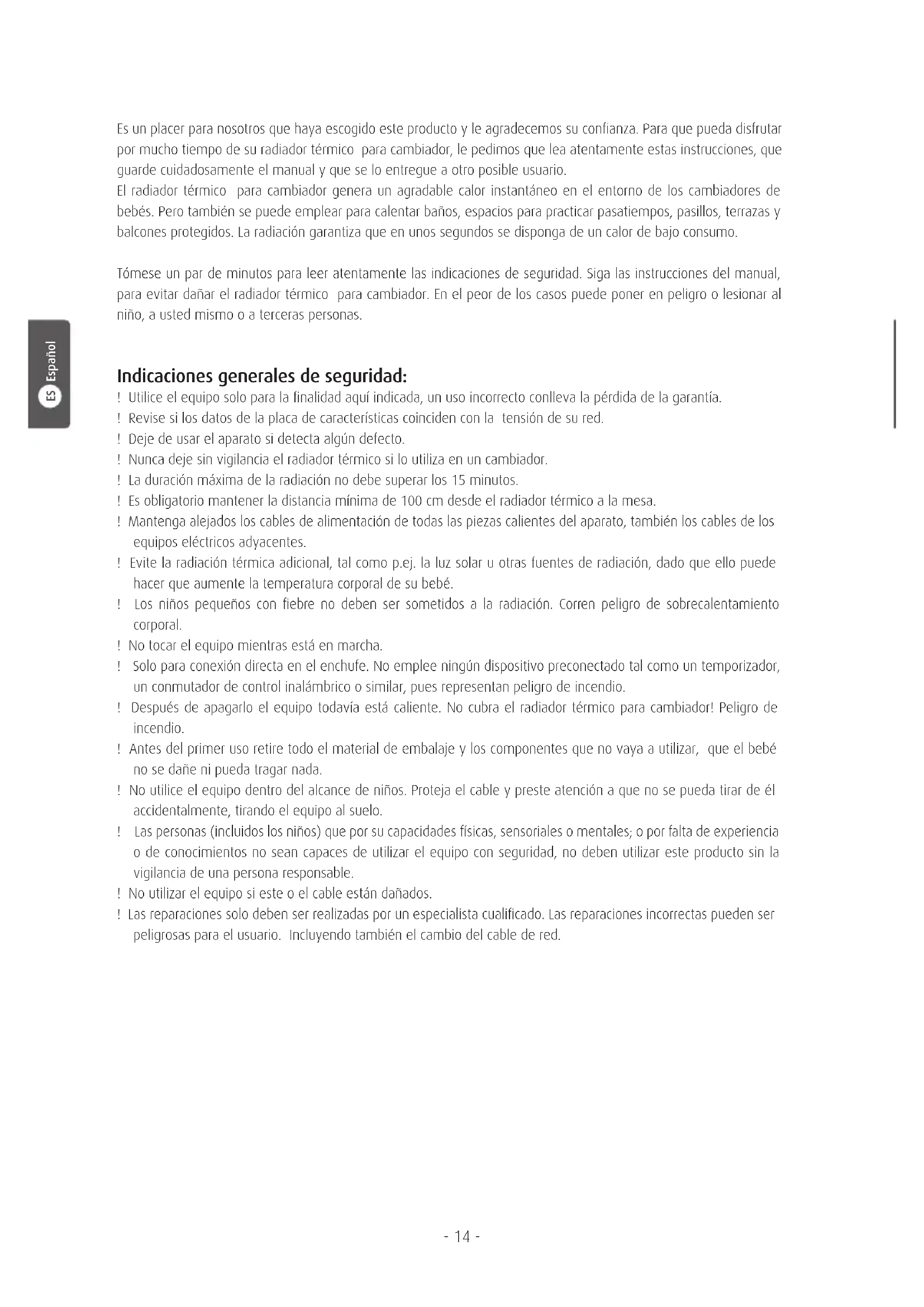 - Repairs must be carried out by skilled personnel only. Please retain your receipt, the user manual and part number. Claims under warranty or under warranty commitments are to be processed by the dealer alone. The technical specification, information and characteristics of the product described herein have been compiled to the best of our knowledge and belief and are correct at the time of printing. Any information provided by reer should be correct and authoritative. Nevertheless, reer does not accept liability for potential errors in this document and reserves the right to make changes to the product design and/or specifications without prior notice. Reproduction and disclosure of information contained in this copyright-protected document, in any form or by any means - graphical, electronic or mechanical by pho- tocopying, recording on tape or storage in a data retrieval system - even in part, require prior written consent from reer. Environmental protection: At the end of its life, this product must not be disposed of as normal domestic waste, but should be recycled at a collection point for electrical appliances. Please see the relevant symbol on the product, in the user manual and packaging. Materials can be recycled as specified. An important contribution to the protection of the environment can be made by reusing the unit, recycling its components or otherwise reusing old appliances. Please contact your local council to find out more about an appropriate disposal centre.- 14 - Es un placer para nosotros que haya escogido este producto y le agradecemos su confianza. Para que pueda disfrutar por mucho tiempo de su radiador térmico para cambiador, le pedimos que lea atentamente estas instrucciones, que guarde cuidadosamente el manual y que se lo entregue a otro posible usuario. El radiador térmico para cambiador genera un agradable calor instantáneo en el entorno de los cambiadores de bebés. Pero también se puede emplear para calentar baños, espacios para practicar pasatiempos, pasillos, terrazas y balcones protegidos. La radiación garantiza que en unos segundos se disponga de un calor de bajo consumo. Tómese un par de minutos para leer atentamente las indicaciones de seguridad. Siga las instrucciones del manual, para evitar dañar el radiador térmico para cambiador. En el peor de los casos puede poner en peligro o lesionar al niño, a usted mismo o a terceras personas. Indicaciones generales de seguridad: ! Utilice el equipo solo para la finalidad aquí indicada, un uso incorrecto conlleva la pérdida de la garantía. ! Revise si los datos de la placa de características coinciden con la tensión de su red. ! Deje de usar el aparato si detecta algún defecto. ! Nunca deje sin vigilancia el radiador térmico si lo utiliza en un cambiador. ! La duración máxima de la radiación no debe superar los 15 minutos. ! Es obligatorio mantener la distancia mínima de 100 cm desde el radiador térmico a la mesa. ! Mantenga alejados los cables de alimentación de todas las piezas calientes del aparato, también los cables de los equipos eléctricos adyacentes. ! Evite la radiación térmica adicional, tal como p.ej. la luz solar u otras fuentes de radiación, dado que ello puede hacer que aumente la temperatura corporal de su bebé. ! Los niños pequeños con fiebre no deben ser sometidos a la radiación. Corren peligro de sobrecalentamiento corporal. ! No tocar el equipo mientras está en marcha. ! Solo para conexión directa en el enchufe. No emplee ningún dispositivo preconectado tal como un temporizador, un conmutador de control inalámbrico o similar, pues representan peligro de incendio. ! Después de apagarlo el equipo todavía está caliente. No cubra el radiador térmico para cambiador! Peligro de incendio. ! Antes del primer uso retire todo el material de embalaje y los componentes que no vaya a utilizar, que el bebé no se dañe ni pueda tragar nada. ! No utilice el equipo dentro del alcance de niños. Proteja el cable y preste atención a que no se pueda tirar de él accidentalmente, tirando el equipo al suelo. ! Las personas (incluidos los niños) que por su capacidades físicas, sensoriales o mentales; o por falta de experiencia o de conocimientos no sean capaces de utilizar el equipo con seguridad, no deben utilizar este producto sin la vigilancia de una persona responsable. ! No utilizar el equipo si este o el cable están dañados. ! Las reparaciones solo deben ser realizadas por un especialista cualificado. Las reparaciones incorrectas pueden ser peligrosas para el usuario. Incluyendo también el cambio del cable de red.