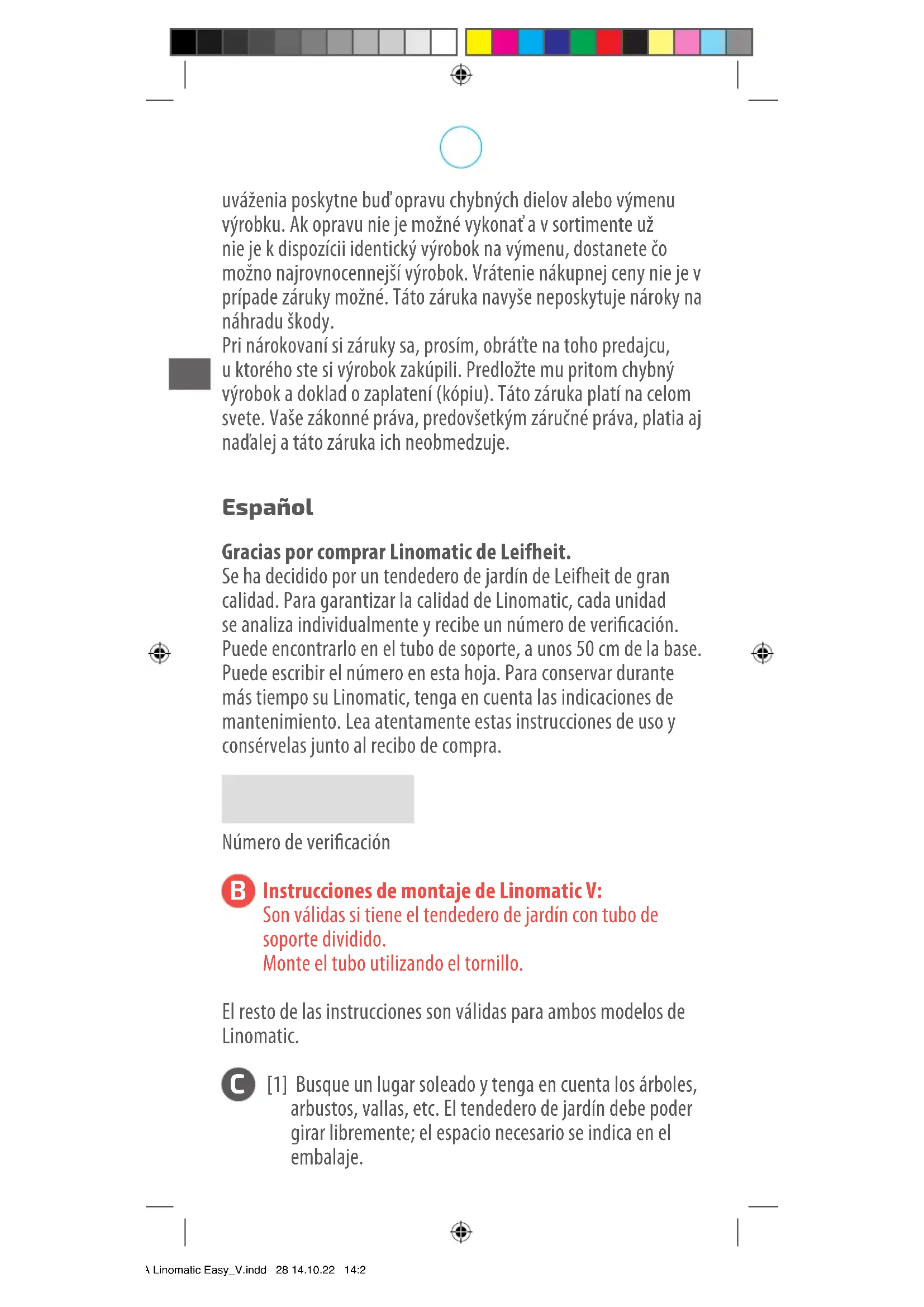 Instrucciones de montaje de Linomatic V: Son válidas si tiene el tendedero de jardín con tubo de soporte dividido. Monte el tubo utilizando el tornillo. El resto de las instrucciones son válidas para ambos modelos de Linomatic.