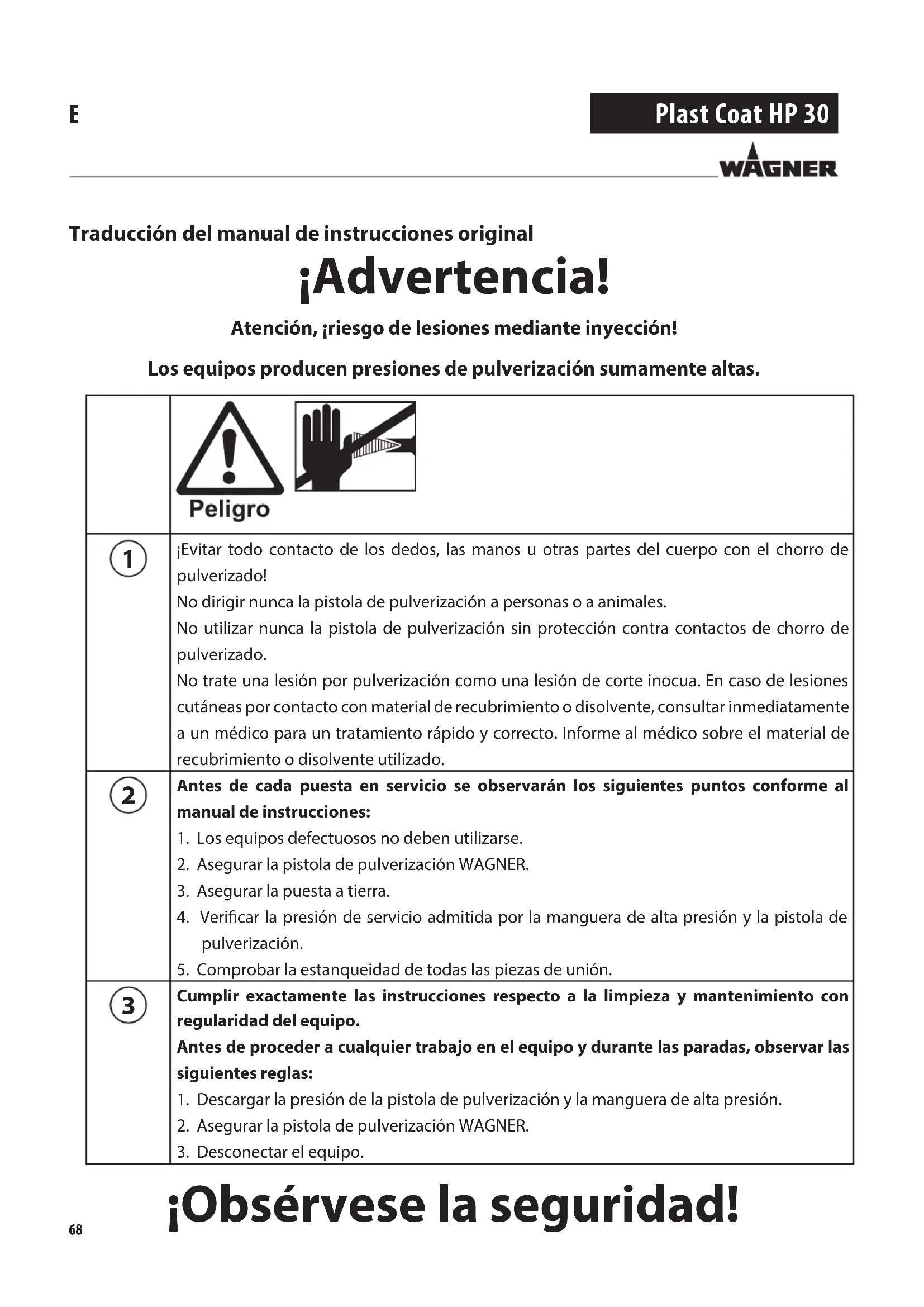 ¡Evitar todo contacto de los dedos, las manos u otras partes del cuerpo con el chorro de pulverizado!No dirigir nunca la pistola de pulverización a personas o a animales.No utilizar nunca la pistola de pulverización sin protección contra contactos de chorro de pulverizado.No trate una lesión por pulverización como una lesión de corte inocua. En caso de lesiones cutáneas por contacto con material de recubrimiento o disolvente, consultar inmediatamente a un médico para un tratamiento rápido y correcto. Informe al médico sobre el material de recubrimiento o disolvente utilizado. Antes de cada puesta en servicio se observarán los siguientes puntos conforme al manual de instrucciones:1. Los equipos defectuosos no deben utilizarse.2. Asegurar la pistola de pulverización WAGNER.3. Asegurar la puesta a tierra.4. Vericar la presión de servicio admitida por la manguera de alta presión y la pistola de pulverización.5. Comprobar la estanqueidad de todas las piezas de unión. Cumplir exactamente las instrucciones respecto a la limpieza y mantenimiento con regularidad del equipo.Antes de proceder a cualquier trabajo en el equipo y durante las paradas, observar las siguientes reglas:1. Descargar la presión de la pistola de pulverización y la manguera de alta presión.2. Asegurar la pistola de pulverización WAGNER.3. Desconectar el equipo. ¡Obsérvese la seguridad! Traducción del manual de instrucciones original69 Plast Coat HP 30