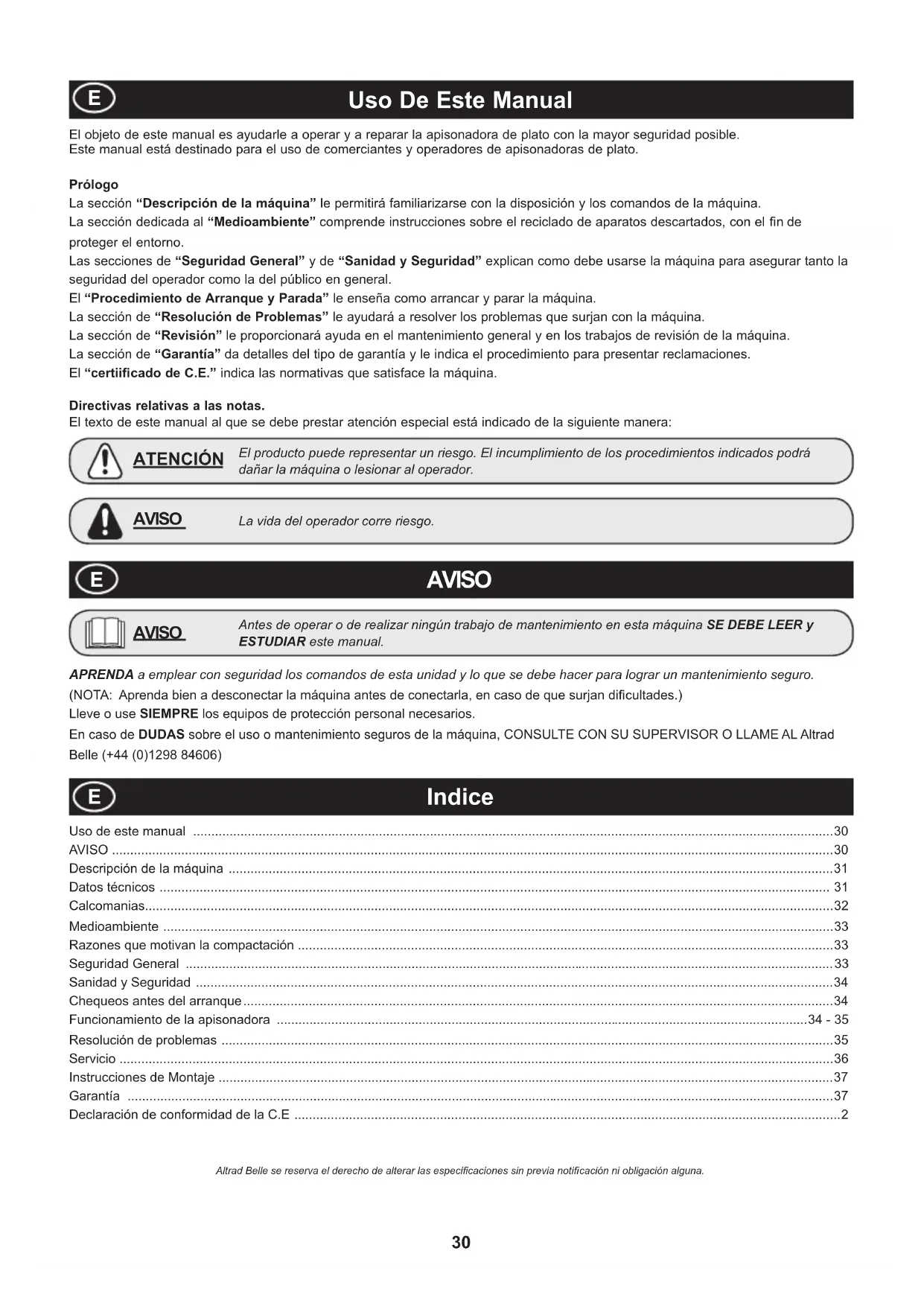 Seguridad General Para su propia protección y la de aquellos que le rodean, lea y aprenda bien la siguiente información relativa a los aspectos de seguridad. El operador es responsable de asegurar que sabe operar bien, y con toda seguridad, este equipo. Si tiene dudas respecto al uso seguro y correcto de esta apisonadora, hable con su supervisor o póngase en contacto con Altrad Belle.