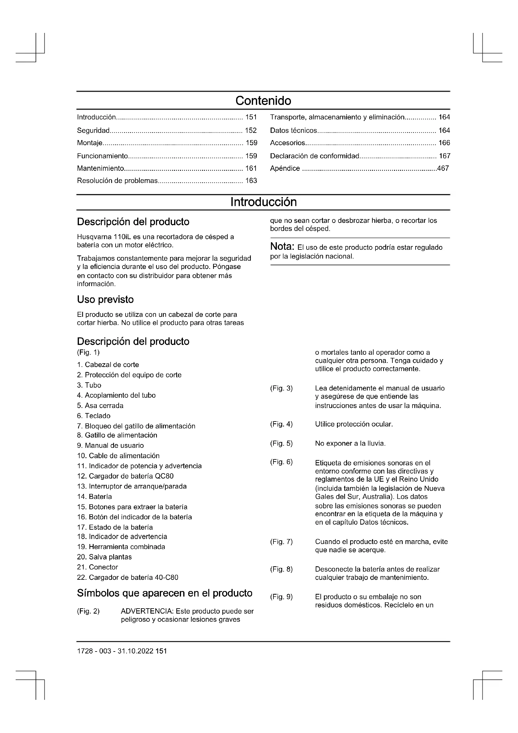 - Huskvarna, 2022-07-05 Claes Losdal, R&D Manager, Husqvarna AB Responsabile della documentazione tecnica 150 1728 - 003 - 31.10.2022Contenido Introducción p. 151