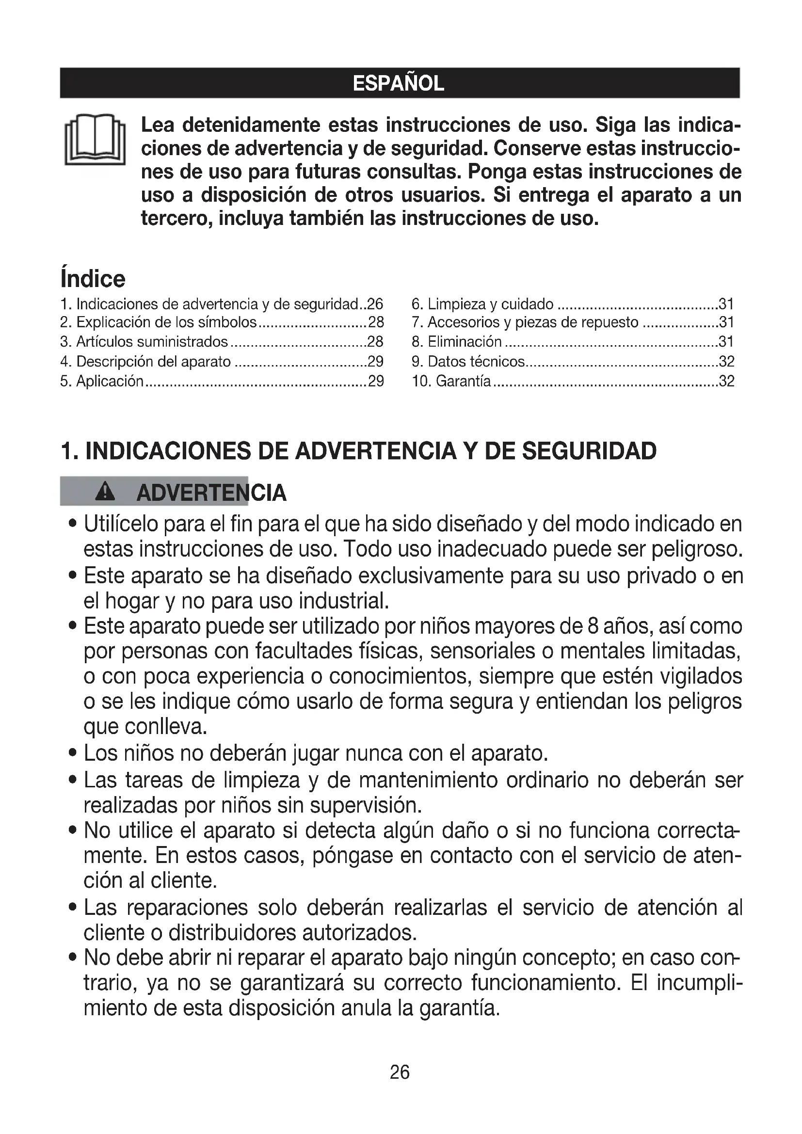 Pour plus d’informations sur la garantie et les conditions de garantie, consultez la fiche de garantie fournie. Sous réserve d’erreurs et de modifications26 Lea detenidamente estas instrucciones de uso. Siga las indica- ciones de advertencia y de seguridad. Conserve estas instruccio- nes de uso para futuras consultas. Ponga estas instrucciones de uso a disposición de otros usuarios. Si entrega el aparato a un tercero, incluya también las instrucciones de uso. Índice ESPAÑOL