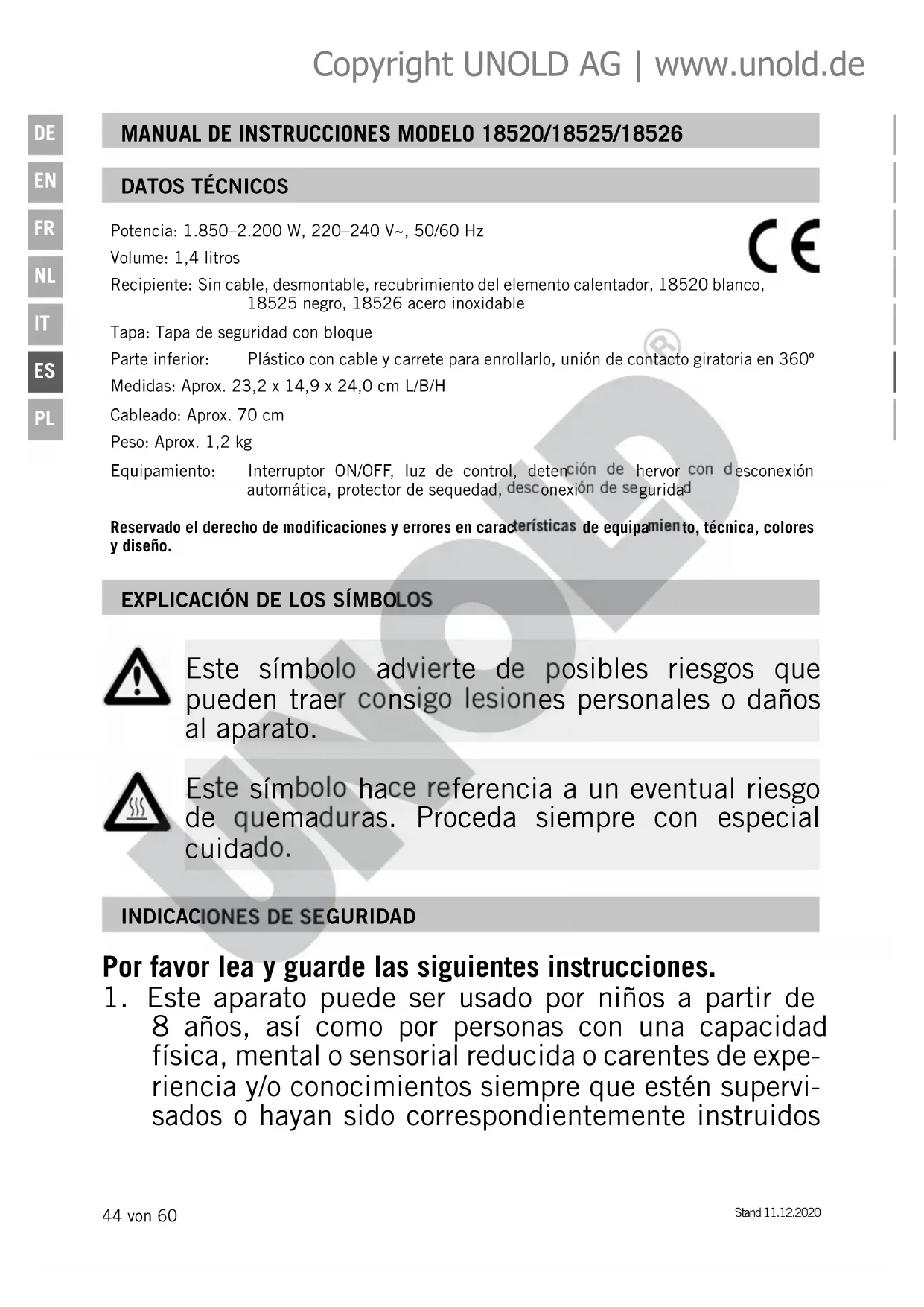 8 años, así como por personas con una capacidad física, mental o sensorial reducida o carentes de expe- riencia y/o conocimientos siempre que estén supervi- sados o hayan sido correspondientemente instruidos Copyright UNOLD AG | www.unold.deStand 11.12.2020 45 von 60