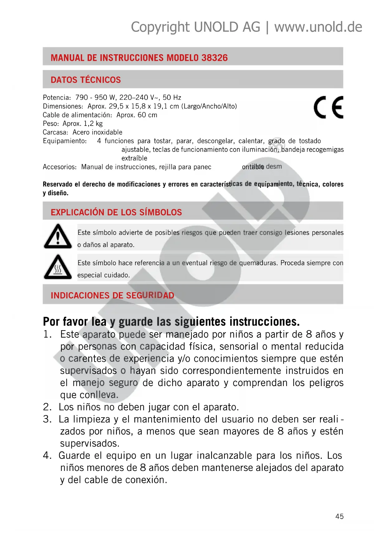 lificada del mismo modo que se va a sustituir, a fin de evitar peligros. El fabricante no asume ninguna responsabilidad en caso de montaje defectuoso, uso inapropiado o inco- rrecto o después de reparaciones realizadas por terceros no autorizados. PRECAUCIÓN: el aparato se calienta mucho durante el funcionamiento. De ninguna manera abra la carcasa del aparato. No introduzca herramientas, cubiertos o partes del cuerpo en las ranuras para el pan. Existe peligro de una descarga eléctrica. Copyright UNOLD AG | www.unold.de48