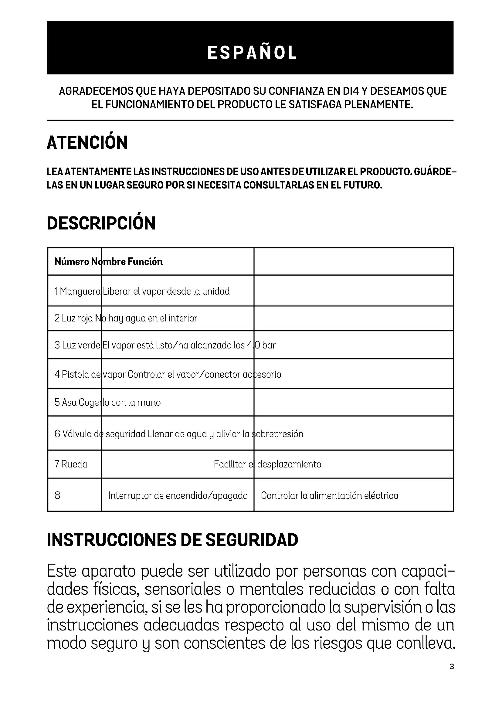 Limpeza a vapor Steam cleaner Nettoyeur à vapeur Pulitore a vapore1 2 3 4 5 6 73 AGRADECEMOS QUE HAYA DEPOSITADO SU CONFIANZA EN DI4 Y DESEAMOS QUE EL FUNCIONAMIENTO DEL PRODUCTO LE SATISFAGA PLENAMENTE. ATENCIÓN LEA ATENTAMENTE LAS INSTRUCCIONES DE USO ANTES DE UTILIZAR EL PRODUCTO. GUÁRDE- LAS EN UN LUGAR SEGURO POR SI NECESITA CONSULTARLAS EN EL FUTURO. DESCRIPCIÓN Número Nombre Función 1 Manguera Liberar el vapor desde la unidad 2 Luz roja No hay agua en el interior 3 Luz verde El vapor está listo/ha alcanzado los 4.0 bar 4 Pistola de vapor Controlar el vapor/conector accesorio 5 Asa Cogerlo con la mano 6 Válvula de seguridad Llenar de agua y aliviar la sobrepresión 7 Rueda Facilitar el desplazamiento 8 Interruptor de encendido/apagado Controlar la alimentación eléctrica