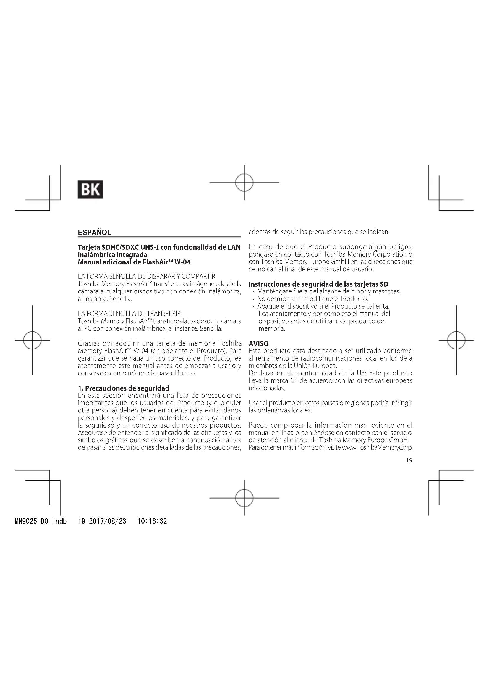 - Apague el dispositivo si el Producto se calienta. Lea atentamente y por completo el manual del dispositivo antes de utilizar este producto de memoria. AVISO Este producto está destinado a ser utilizado conforme al reglamento de radiocomunicaciones local en los de a miembros de la Unión Europea. Declaración de conformidad de la UE: Este producto lleva la marca CE de acuerdo con las directivas europeas relacionadas. Usar el producto en otros países o regiones podría infringir las ordenanzas locales. Puede comprobar la información más reciente en el manual en línea o poniéndose en contacto con el servicio de atención al cliente de Toshiba Memory Europe GmbH. Para obtener más información, visite www.ToshibaMemoryCorp. MN9025-D0.indb 19 2017/08/23 10:16:3220 com Línea de asistencia: +49(0)211 – 53827171 (est.: 0,14 €/min desde línea ja, 0,42 €/min desde móvil de Alemania)