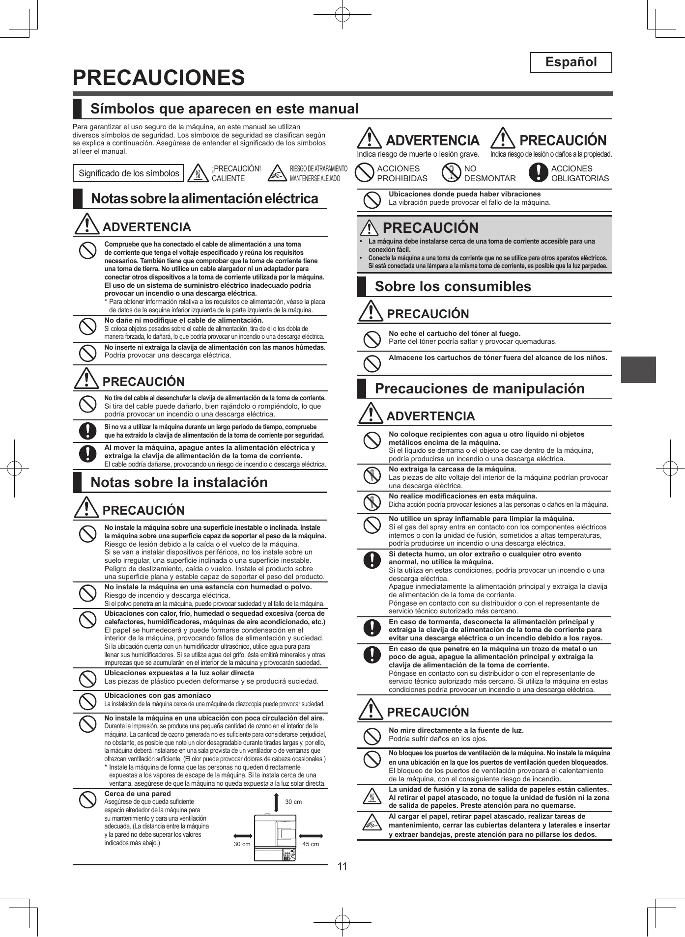 Durante la impresión, se produce una pequeña cantidad de ozono en el interior de la máquina. La cantidad de ozono generada no es suficiente para considerarse perjudicial, no obstante, es posible que note un olor desagradable durante tiradas largas y, por ello, la máquina deberá instalarse en una sala provista de un ventilador o de ventanas que ofrezcan ventilación suficiente. (El olor puede provocar dolores de cabeza ocasionales.) * Instale la máquina de forma que las personas no queden directamente expuestas a los vapores de escape de la máquina. Si la instala cerca de una ventana, asegúrese de que la máquina no queda expuesta a la luz solar directa. Cerca de una pared 30 cm Asegúrese de que queda suficiente espacio alrededor de la máquina para su mantenimiento y para una ventilación adecuada. (La distancia entre la máquina y la pared no debe superar los valores indicados más abajo.) 30 cm 45 cm