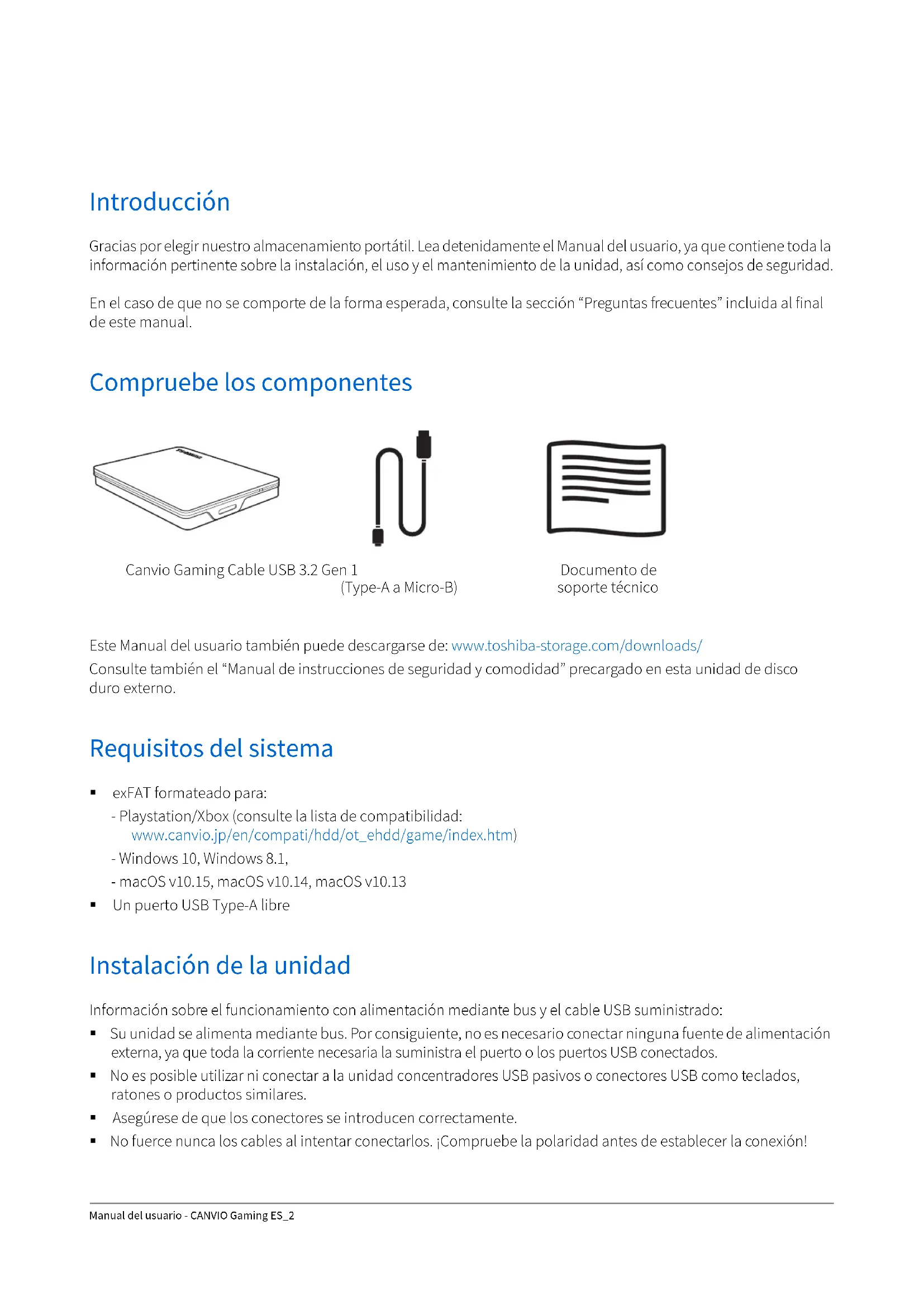 - Información sobre legislaciones vigentes Manual del usuario - CANVIO Gaming ES_2 Introducción Gracias por elegir nuestro almacenamiento portátil. Lea detenidamente el Manual del usuario, ya que contiene toda la información pertinente sobre la instalación, el uso y el mantenimiento de la unidad, así como consejos de seguridad. En el caso de que no se comporte de la forma esperada, consulte la sección “Preguntas frecuentes” incluida al final de este manual. Compruebe los componentes Este Manual del usuario también puede descargarse de: www.toshiba-storage.com/downloads/ Consulte también el “Manual de instrucciones de seguridad y comodidad” precargado en esta unidad de disco duro externo. Requisitos del sistema exFAT formateado para: - Playstation/Xbox (consulte la lista de compatibilidad: www.canvio.jp/en/compati/hdd/ot_ehdd/game/index.htm) - Windows 10, Windows 8.1, - macOS v10.15, macOS v10.14, macOS v10.13 Un puerto USB Type-A libre Instalación de la unidad Información sobre el funcionamiento con alimentación mediante bus y el cable USB suministrado: Su unidad se alimenta mediante bus. Por consiguiente, no es necesario conectar ninguna fuente de alimentación externa, ya que toda la corriente necesaria la suministra el puerto o los puertos USB conectados. No es posible utilizar ni conectar a la unidad concentradores USB pasivos o conectores USB como teclados, ratones o productos similares. Asegúrese de que los conectores se introducen correctamente. No fuerce nunca los cables al intentar conectarlos. ¡Compruebe la polaridad antes de establecer la conexión! Canvio Gaming Cable USB 3.2 Gen 1 (Type-A a Micro-B) Documento de soporte técnicoManual del usuario - CANVIO Gaming ES_3 Conexión de la unidad a su dispositivo compatible Consulte la compatibilidad de los dispositivos y las instrucciones de conexión revisando los manuales de usuario de los correspondientes dispositivos. p. 6