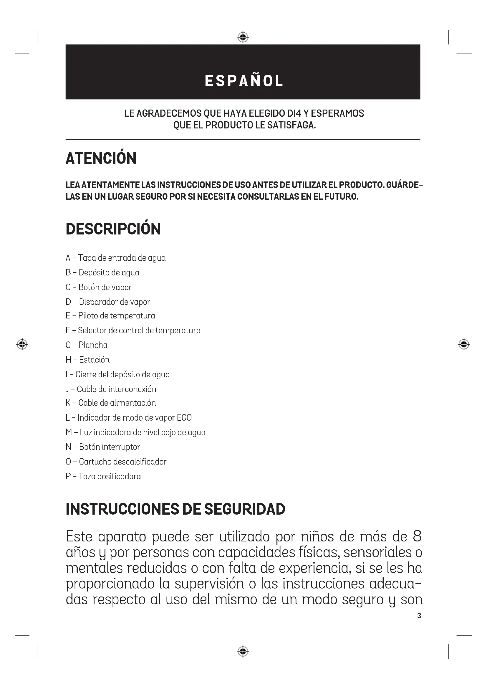 LE AGRADECEMOS QUE HAYA ELEGIDO DI4 Y ESPERAMOS QUE EL PRODUCTO LE SATISFAGA. ATENCIÓN LEA ATENTAMENTE LAS INSTRUCCIONES DE USO ANTES DE UTILIZAR EL PRODUCTO. GUÁRDE- LAS EN UN LUGAR SEGURO POR SI NECESITA CONSULTARLAS EN EL FUTURO. DESCRIPCIÓN A - Tapa de entrada de agua B - Depósito de agua C - Botón de vapor D - Disparador de vapor E - Piloto de temperatura F - Selector de control de temperatura G - Plancha H - Estación I - Cierre del depósito de agua J - Cable de interconexión K - Cable de alimentación L - Indicador de modo de vapor ECO M - Luz indicadora de nivel bajo de agua N - Botón interruptor O - Cartucho descalcificador P - Taza dosificadora