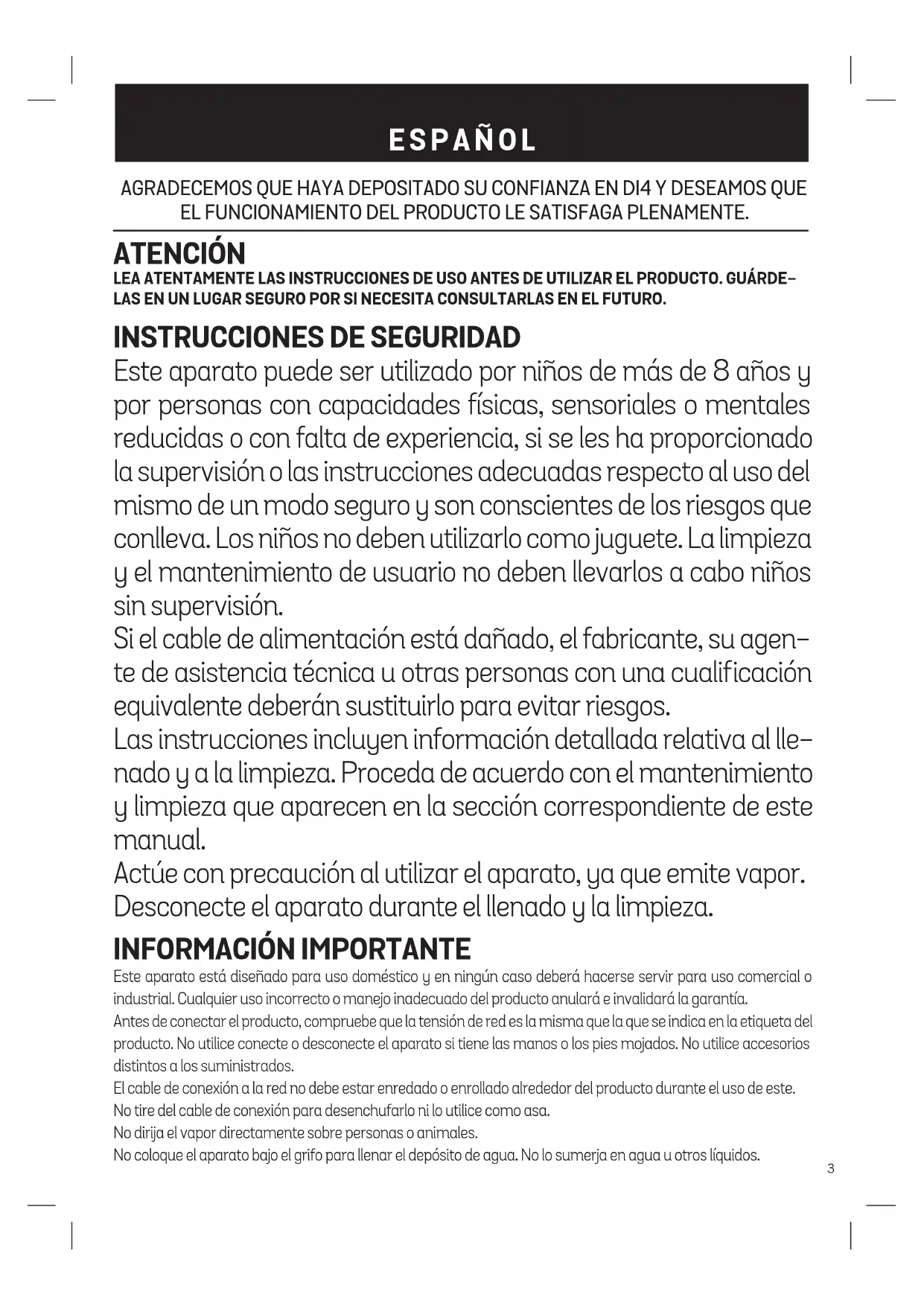 ESPAÑoL AGRADECEMOS QUE HAYA DEPOSITADO SU CONFIANZA EN DI4 Y DESEAMOS QUE EL FUNCIONAMIENTO DEL PRODUCTO LE SATISFAGA PLENAMENTE. AtENCIÓN LEA AtENtAMENtE LAS INStRUCCIoNES DE USo ANtES DE UtILIzAR EL PRoDUCto. GUÁRDE- LAS EN UN LUGAR SEGURo PoR SI NECESItA CoNSULtARLAS EN EL FUtURo. INStRUCCIoNES DE SEGURIDAD Este aparato puede ser utilizado por niños de más de 8 años y por personas con capacidades físicas, sensoriales o mentales reducidas o con falta de experiencia, si se les ha proporcionado la supervisión o las instrucciones adecuadas respecto al uso del mismo de un modo seguro y son conscientes de los riesgos que conlleva. Los niños no deben utilizarlo como juguete. La limpieza y el mantenimiento de usuario no deben llevarlos a cabo niños sin supervisión. Si el cable de alimentación está dañado, el fabricante, su agen- te de asistencia técnica u otras personas con una cualificación equivalente deberán sustituirlo para evitar riesgos. Las instrucciones incluyen información detallada relativa al lle- nado y a la limpieza. Proceda de acuerdo con el mantenimiento y limpieza que aparecen en la sección correspondiente de este manual. Actúe con precaución al utilizar el aparato, ya que emite vapor. Desconecte el aparato durante el llenado y la limpieza. INFoRMACIÓN IMPoRtANtE Este aparato está diseñado para uso doméstico y en ningún caso deberá hacerse servir para uso comercial o industrial. Cualquier uso incorrecto o manejo inadecuado del producto anulará e invalidará la garantía. Antes de conectar el producto, compruebe que la tensión de red es la misma que la que se indica en la etiqueta del producto. No utilice conecte o desconecte el aparato si tiene las manos o los pies mojados. No utilice accesorios distintos a los suministrados. El cable de conexión a la red no debe estar enredado o enrollado alrededor del producto durante el uso de este. No tire del cable de conexión para desenchufarlo ni lo utilice como asa. No dirija el vapor directamente sobre personas o animales. No coloque el aparato bajo el grifo para llenar el depósito de agua. No lo sumerja en agua u otros líquidos.4 Desconecte inmediatamente el producto de la red en caso de detectar averías o daños y póngase en contacto con el servicio de asistencia técnica autorizado. A fin de evitar riesgos o peligros, no abra el aparato. Solo personal técnico cualificado del servicio de asistencia técnica oficial de la marca puede llevar a cabo reparaciones u otras operaciones en el aparato. Solo un centro de asistencia técnica autorizado puede efectuar reparaciones en este producto. B&B tRENDS, S.L. declina cualquier responsabilidad por los daños que puedan ocasionarse a personas, anima- les u objetos como consecuencia de la no observación de las advertencias anteriores. ANtES DE UtILIzAR EL APARAto PoR PRIMERA VEz La primera vez que utilice el aparato, éste puede desprender olores o humos que se emiten rápidamente. Cuando utilice la plancha de vapor por primera vez, no pulverice directamente sobre la ropa por si hubiera suciedad en el cabezal de vapor. Retire el enchufe de la toma de corriente antes de proceder al llenado (o vaciado) del aparato Inserte la barra de aluminio telescópica en los soportes, seguidamente abra el bloqueo de la barra de aluminio y expanda el aluminio telescópico. A continuación bloquee la cerradura de la barra de aluminio para fijarlos. Inserte la percha en la parte superior. Instale el botón del tubo de vapor en posición fija y gire a la izquierda hasta la posición de bloqueo. Saque el depósito de agua y desatornille el tapón de llenado. Llene el depósito hasta arriba y atornille el recipiente de llenado. El aparato ha sido diseñado para funcionar con agua del grifo no tratada. Vuelva a poner el depósito de agua en su lugar en el aparato y enchúfelo. No utilice agua pura desmineralizada ni agua destilada, agua de secadores de ropa, agua perfumada o emblande- cida, agua de lluvia, filtrada, embotellada o hervida, agua de refrigeradores, baterías o aires acondicionados, ya que podría causar daños al aparato. Se trata de aguas que contienen residuos orgánicos, elementos minerales que se concentran al calentarlos y causan fragmentación, manchas de color marrón, escapes o deterioros prematuros en el aparato. En caso de aguas muy duras mezcle 50 % de agua del grifo no procesada con 50 % de agua destilada. INStRUCCIoNES DE USo Antes de utiliza r el aparato, compruebe las etiquetas del tejido para consultar las recomendaciones. Le recomendamos que pruebe con acrílicos, nilón u otros tejidos sintéticos en áreas discretas, para asegurarse de que el vapor no los dañe. Para planchar, use la ropa de la percha. Conecte el aparato y gire el botón a la izquierda (G). La luz será más brillante. Espere aproximadamente 1min. El aparato estará listo para su uso. Puede elegir la cantidad de vapor que necesite según el tipo de tela. Para un uso óptimo, pase los chorros de vapor por encima de una prenda, de arriba abajo. El vapor está muy caliente: nunca intente retirar las arrugas de una prenda mientras la lleva puesta. Siempre debe colgarlas en una percha. El cepillo para tela abre los tejidos para una mejor penetración del vapor, y la abrazadera sirve para hacer pliegues en la ropa. Antes de retirar o de incorporar el cepillo de vapor o abrazadera, desconecte el aparato y deje que se enfríe. Durante el uso o mientras la unidad se esté enfriando o calentando, no la deje apoyada sobre el cabezal. Colóquela sobre una superficie estable, resistente al calor y lisa, ya que el cabezal estará caliente. Al calentarse, la carcasa también aumenta la temperatura. Es normal. Retire el enchufe de la toma de corriente. Espere una hora para que el aparato esté frío y pueda guardarlo. MANtENIMIENto Y LIMPIEzA Una vez utilizado, extraiga el depósito de agua, vacíelo por completo y vuelva a colocarlo en su lugar.5 Antes de limpiar el vaporizado r de prendas, 