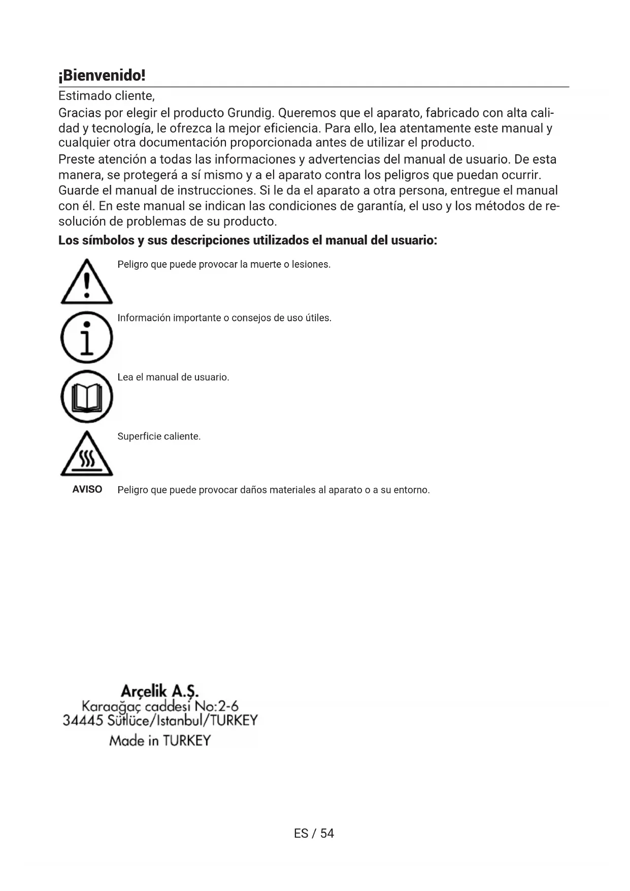 ESES / 54 ¡Bienvenido! Estimado cliente, Gracias por elegir el producto Grundig. Queremos que el aparato, fabricado con alta cali- dad y tecnología, le ofrezca la mejor eficiencia. Para ello, lea atentamente este manual y cualquier otra documentación proporcionada antes de utilizar el producto. Preste atención a todas las informaciones y advertencias del manual de usuario. De esta manera, se protegerá a sí mismo y a el aparato contra los peligros que puedan ocurrir. Guarde el manual de instrucciones. Si le da el aparato a otra persona, entregue el manual con él. En este manual se indican las condiciones de garantía, el uso y los métodos de re- solución de problemas de su producto. Los símbolos y sus descripciones utilizados el manual del usuario: Peligro que puede provocar la muerte o lesiones. Información importante o consejos de uso útiles. Lea el manual de usuario. Superficie caliente. AVISO Peligro que puede provocar daños materiales al aparato o a su entorno.ES / 55 Tabla de contenidos 1 Instrucciones de Seguridad......... 56