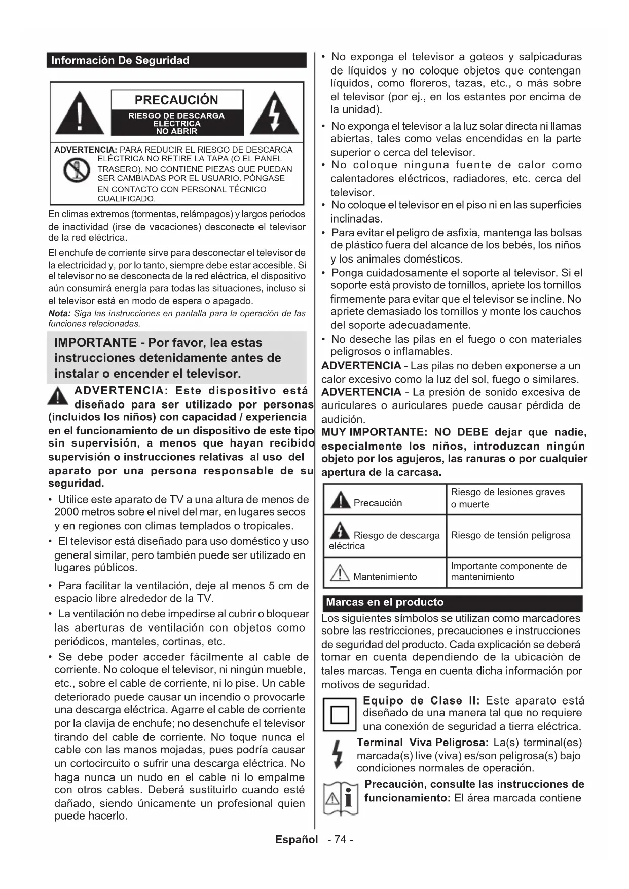- No deseche las pilas en el fuego o con materiales peligrosos o inflamables. ADVERTENCIA - Las pilas no deben exponerse a un calor excesivo como la luz del sol, fuego o similares. ADVERTENCIA - La presión de sonido excesiva de auriculares o auriculares puede causar pérdida de audición. MUY IMPORTANTE: NO DEBE dejar que nadie, especialmente los niños, introduzcan ningún objeto por los agujeros, las ranuras o por cualquier apertura de la carcasa. Precaución Riesgo de lesiones graves o muerte Riesgo de descarga eléctrica Riesgo de tensión peligrosa Mantenimiento Importante componente de mantenimiento Marcas en el producto Los siguientes símbolos se utilizan como marcadores sobre las restricciones, precauciones e instrucciones de seguridad del producto. Cada explicación se deberá tomar en cuenta dependiendo de la ubicación de tales marcas. Tenga en cuenta dicha información por motivos de seguridad. Equipo de Clase II: Este aparato está diseñado de una manera tal que no requiere una conexión de seguridad a tierra eléctrica. Terminal Viva Peligrosa: La(s) terminal(es) marcada(s) live (viva) es/son peligrosa(s) bajo condiciones normales de operación.