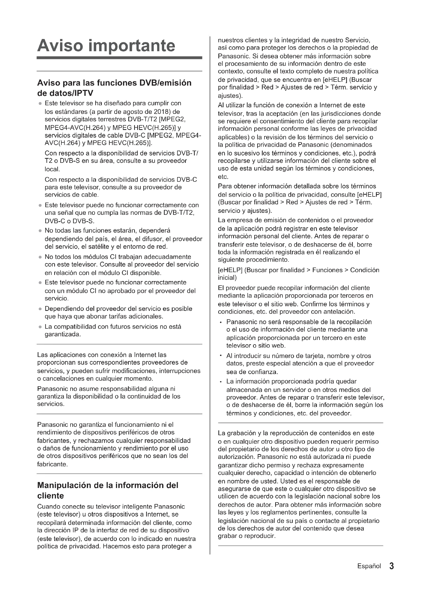 La compatibilidad con futuros servicios no está garantizada. Las aplicaciones con conexión a Internet las proporcionan sus correspondientes proveedores de servicios, y pueden sufrir modificaciones, interrupciones o cancelaciones en cualquier momento. Panasonic no asume responsabilidad alguna ni garantiza la disponibilidad o la continuidad de los servicios. Panasonic no garantiza el funcionamiento ni el rendimiento de dispositivos periféricos de otros fabricantes, y rechazamos cualquier responsabilidad o daños de funcionamiento y rendimiento por el uso de otros dispositivos periféricos que no sean los del fabricante. Manipulación de la información del cliente Cuando conecte su televisor inteligente Panasonic (este televisor) u otros dispositivos a Internet, se recopilará determinada información del cliente, como la dirección IP de la interfaz de red de su dispositivo (este televisor), de acuerdo con lo indicado en nuestra política de privacidad. Hacemos esto para proteger a nuestros clientes y la integridad de nuestro Servicio, así como para proteger los derechos o la propiedad de Panasonic. Si desea obtener más información sobre el procesamiento de su información dentro de este contexto, consulte el texto completo de nuestra política de privacidad, que se encuentra en [eHELP] (Buscar por finalidad > Red > Ajustes de red > Térm. servicio y ajustes). Al utilizar la función de conexión a Internet de este televisor, tras la aceptación (en las jurisdicciones donde se requiere el consentimiento del cliente para recopilar información personal conforme las leyes de privacidad aplicables) o la revisión de los términos del servicio o la política de privacidad de Panasonic (denominados en lo sucesivo los términos y condiciones, etc.), podrá recopilarse y utilizarse información del cliente sobre el uso de esta unidad según los términos y condiciones, etc. Para obtener información detallada sobre los términos del servicio o la política de privacidad, consulte [eHELP] (Buscar por finalidad > Red > Ajustes de red > Térm. servicio y ajustes). La empresa de emisión de contenidos o el proveedor de la aplicación podrá registrar en este televisor información personal del cliente. Antes de reparar o transferir este televisor, o de deshacerse de él, borre toda la información registrada en él realizando el siguiente procedimiento. [eHELP] (Buscar por finalidad > Funciones > Condición inicial) El proveedor puede recopilar información del cliente mediante la aplicación proporcionada por terceros en este televisor o el sitio web. Confirme los términos y condiciones, etc. del proveedor con antelación.
