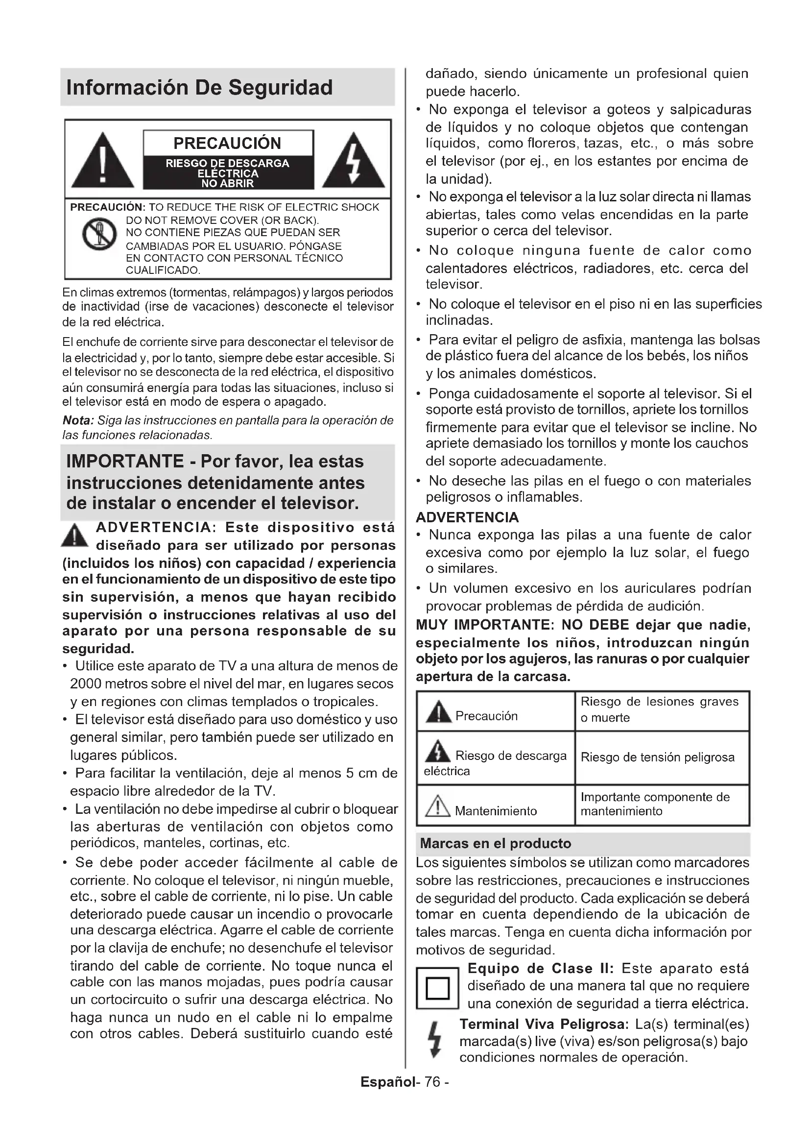 - Un volumen excesivo en los auriculares podrían provocar problemas de pérdida de audición. MUY IMPORTANTE: NO DEBE dejar que nadie, especialmente los niños, introduzcan ningún objeto por los agujeros, las ranuras o por cualquier apertura de la carcasa. Precaución Riesgo de lesiones graves o muerte Riesgo de descarga eléctrica Riesgo de tensión peligrosa Mantenimiento Importante componente de mantenimiento Marcas en el producto Los siguientes símbolos se utilizan como marcadores sobre las restricciones, precauciones e instrucciones de seguridad del producto. Cada explicación se deberá tomar en cuenta dependiendo de la ubicación de tales marcas. Tenga en cuenta dicha información por motivos de seguridad. Equipo de Clase II: Este aparato está diseñado de una manera tal que no requiere una conexión de seguridad a tierra eléctrica. Terminal Viva Peligrosa: La(s) terminal(es) marcada(s) live (viva) es/son peligrosa(s) bajo condiciones normales de operación.Español- 77 -