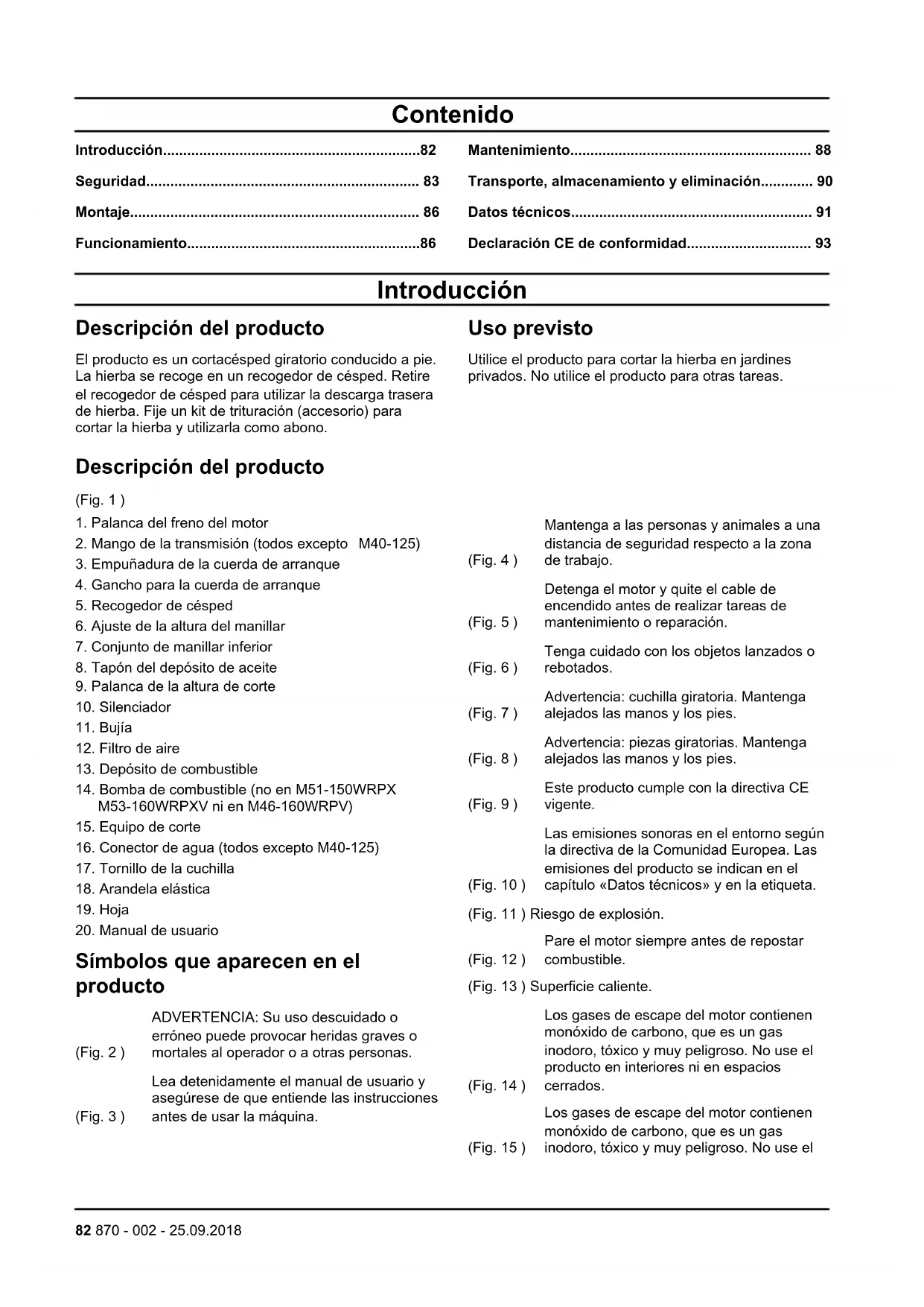 Símbolos que aparecen en el producto (Fig. 2 ) ADVERTENCIA: Su uso descuidado o erróneo puede provocar heridas graves o mortales al operador o a otras personas. (Fig. 3 ) Lea detenidamente el manual de usuario y asegúrese de que entiende las instrucciones antes de usar la máquina. (Fig. 4 ) Mantenga a las personas y animales a una distancia de seguridad respecto a la zona de trabajo. (Fig. 5 ) Detenga el motor y quite el cable de encendido antes de realizar tareas de mantenimiento o reparación. (Fig. 6 ) Tenga cuidado con los objetos lanzados o rebotados. (Fig. 7 ) Advertencia: cuchilla giratoria. Mantenga alejados las manos y los pies. (Fig. 8 ) Advertencia: piezas giratorias. Mantenga alejados las manos y los pies. (Fig. 9 ) Este producto cumple con la directiva CE vigente. (Fig. 10 ) Las emisiones sonoras en el entorno según la directiva de la Comunidad Europea. Las emisiones del producto se indican en el capítulo «Datos técnicos» y en la etiqueta. (Fig. 11 ) Riesgo de explosión. (Fig. 12 ) Pare el motor siempre antes de repostar combustible. (Fig. 13 ) Superficie caliente. (Fig. 14 ) Los gases de escape del motor contienen monóxido de carbono, que es un gas inodoro, tóxico y muy peligroso. No use el producto en interiores ni en espacios cerrados. (Fig. 15 ) Los gases de escape del motor contienen monóxido de carbono, que es un gas inodoro, tóxico y muy peligroso. No use el 82 870 - 002 - 25.09.2018producto en interiores ni en espacios cerrados. Nota: Los demás símbolos/etiquetas que aparecen en el producto corresponden a requisitos de homologación específicos en otras zonas comerciales. UE V ADVERTENCIA: La manipulación del motor anula la homologación de la UE de este producto. Responsabilidad sobre el producto Como se estipula en las leyes de responsabilidad del producto, no nos hacemos responsables de los daños y perjuicios causados por nuestro producto si: