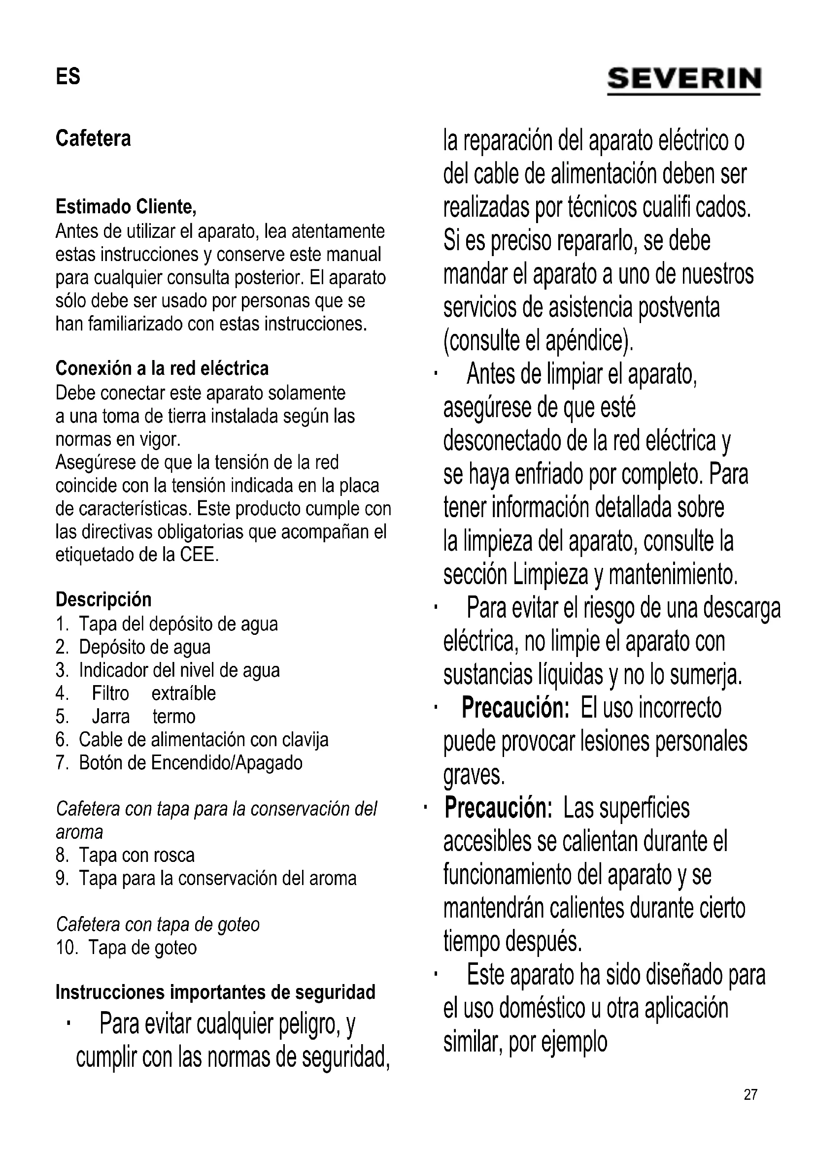 Instrucciones importantes de seguridad ∙ Para evitar cualquier peligro, y cumplir con las normas de seguridad, la reparación del aparato eléctrico o del cable de alimentación deben ser realizadas por técnicos cualifi cados. Si es preciso repararlo, se debe mandar el aparato a uno de nuestros servicios de asistencia postventa (consulte el apéndice). ∙ Antes de limpiar el aparato, asegúrese de que esté desconectado de la red eléctrica y se haya enfriado por completo. Para tener información detallada sobre la limpieza del aparato, consulte la sección Limpieza y mantenimiento. ∙ Para evitar el riesgo de una descarga eléctrica, no limpie el aparato con sustancias líquidas y no lo sumerja. ∙ Precaución: El uso incorrecto puede provocar lesiones personales graves. ∙ Precaución: Las superfi cies accesibles se calientan durante el funcionamiento del aparato y se mantendrán calientes durante cierto tiempo después. ∙ Este aparato ha sido diseñado para el uso doméstico u otra aplicación similar, por ejemplo ES28 - en cocinas de personal, en ofi cinas y otros puntos comerciales, - en empresas agrícolas, - por los clientes de hoteles, pensiones, etc. y alojamientos similares, - en casas rurales. ∙ Este aparato podrá ser utilizado por niños (mayores de 8 años) y personas con reducidas facultades físicas, sensoriales o mentales, o sin experiencia ni conocimiento del producto, siempre que hayan recibido la supervisión o instrucciones referentes al uso del aparato y entiendan por completo el peligro y las precauciones de seguridad. ∙ Los niños no deben jugar con el aparato. ∙ No se debe permitir que los niños realicen ningún trabajo de limpieza o mantenimiento del aparato a menos que esté bajo vigilancia y tengan más de 8 años. ∙ El aparato y su cable eléctrico siempre se deben mantener fuera del alcance de niños menores de 8 años. ∙ Precaución: mantenga a los niños alejados del material de embalaje, porque podría ser peligroso, existe el peligro de asfi xia. ∙ Antes de utilizar el aparato, siempre se debe comprobar que tanto la unidad principal, el cable de alimentación como cualquier accesorio no están defectuosos. En caso de que el aparato haya caído sobre una superfi cie dura, o se haya tirado en exceso del cable de alimentación, no se deberá utilizar de nuevo: incluso los desperfectos no visibles pueden tener efectos adversos sobre la seguridad en el uso del aparato. ∙ Durante su operación, la cafetera deberá hallarse en una superfi cie plana y no deslizante, no porosa para salpicaduras o las manchas. ∙ Evite que la unidad o el cable de alimentación entren en contacto con superfi cies calientes o fuentes de calor. ∙ Para evitar el peligro de emisión de agua caliente o vapor, apague siempre la cafetera y permita que se enfríe durante sufi ciente tiempo antes de abrirla o extraer cualquier accesorio o pieza. ∙ Los niños deben estar bajo supervisión para garantizar que no juegan con el aparato. ∙ Desenchufe el cable eléctrico de la toma de la pared - en caso de funcionamiento incorrecto, - durante la limpieza, - si no va a utilizar el aparato durante un largo periodo de tiempo. ∙ Cuando se desenchufa la clavija de la pared, nunca tirar del cable de alimentación. ∙ No permita que el cable eléctrico cuelgue29 suelto; se debe mantener el cable sufi cientemente alejado de las partes calientes del aparato. ∙ No se acepta responsabilidad alguna si hay averías a consecuencia del uso incorrecto del aparato o si estas instrucciones no han sido observadas debidamente. Desconexión automática Para ahorrar energía, el aparato se apagará automáticamente cuando haya fi nalizado el ciclo de elaboración del café. Antes de emplearlo por primera vez Antes de hacer café la primera vez, haga funcionar el aparato durante dos o tres ciclos de fi ltración utilizando la cantidad máxima indicada de agua, pero sin utilizar café molido. Esto también debería realizarse cuando no se ha utilizado el aparato durante un largo periodo de tiempo, y después de eliminar los depósitos de cal. Información general ∙ Existe una escala graduada en el recipiente del agua que facilita la tarea de llenado del recipiente con la cantidad correcta de agua limpia. Con dos escalas graduadas, la escala de la izquierda se utiliza para tazas de tamaño normal de aprox.125ml, mientras que la escala de la derecha se utiliza para tazas más pequeñas. Asegúrese de no exceder la cantidad máxima indicada de agua. ∙ Precaución: la salida de agua caliente está integrada en la tapa del depósito de agua. No intente abrir la tapa durante el proceso de elaboración del café: existe peligro de quemaduras. ∙ Si necesita realizar varios ciclos consecutivos de elaboración de café, deberá esperar aproximadamente 5 minutos después de cada ciclo para que el aparato se enfríe. ∙ Aviso importante: Al llenar el aparato con agua fresca poco después de concluir un ciclo de elaboración de café, existe peligro de quemaduras debido al agua caliente o vapor procedente de la salida del agua. Elaboración del café ∙ Llenar con agua: Abra la tapa del recipiente de agua y llene el recipiente con la cantidad deseada de agua. ∙ Introducir el fi ltro de papel: Abra el fi ltro extraíble hacia el lado e introduzca un fi ltro de papel de tamaño-4, primero debe doblar los lados perforados del fi ltro. ∙ Llenar con café molido: Para cada taza de tamaño normal (125ml), se necesita una medida de aproximadamente 6 g (=1½ - 2 cucharadas de postre) de café fi namente molido. Después, cierre la tapa del recipiente de agua. ∙ Preparar la jarra: Coloque la tapa para la conservación del aroma o la tapa de goteo para la conservación en la jarra, y después sitúe la jarra en el aparato. Si se ha introducido correctamente, la tapa conseguirá desactivar el mecanismo interrumpe-goteo del fi ltro durante el ciclo de elaboración del café. ∙ Iniciar el ciclo
