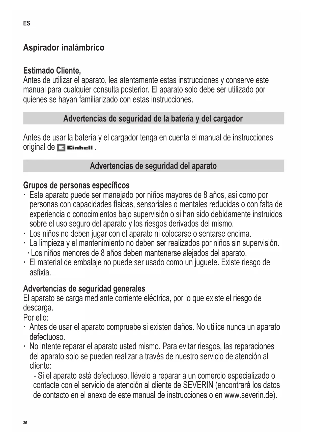 Advertencias de seguridad del aparato Grupos de personas especícos ∙ Este aparato puede ser manejado por niños mayores de 8 años, así como por personas con capacidades físicas, sensoriales o mentales reducidas o con falta de experiencia o conocimientos bajo supervisión o si han sido debidamente instruidos sobre el uso seguro del aparato y los riesgos derivados del mismo. ∙ Los niños no deben jugar con el aparato ni colocarse o sentarse encima. ∙ La limpieza y el mantenimiento no deben ser realizados por niños sin supervisión. ∙ Los niños menores de 8 años deben mantenerse alejados del aparato. ∙ El material de embalaje no puede ser usado como un juguete. Existe riesgo de asxia. Advertencias de seguridad generales El aparato se carga mediante corriente eléctrica, por lo que existe el riesgo de descarga. Por ello: ∙ Antes de usar el aparato compruebe si existen daños. No utilice nunca un aparato defectuoso. ∙ No intente reparar el aparato usted mismo. Para evitar riesgos, las reparaciones del aparato solo se pueden realizar a través de nuestro servicio de atención al cliente: - Si el aparato está defectuoso, llévelo a reparar a un comercio especializado o contacte con el servicio de atención al cliente de SEVERIN (encontrará los datos de contacto en el anexo de este manual de instrucciones o en www.severin.de). ES37 142 x 208 mm - Si la batería o el cargador están defectuosos -contacte con el servicio de atención al cliente (véase el manual de instrucciones original de