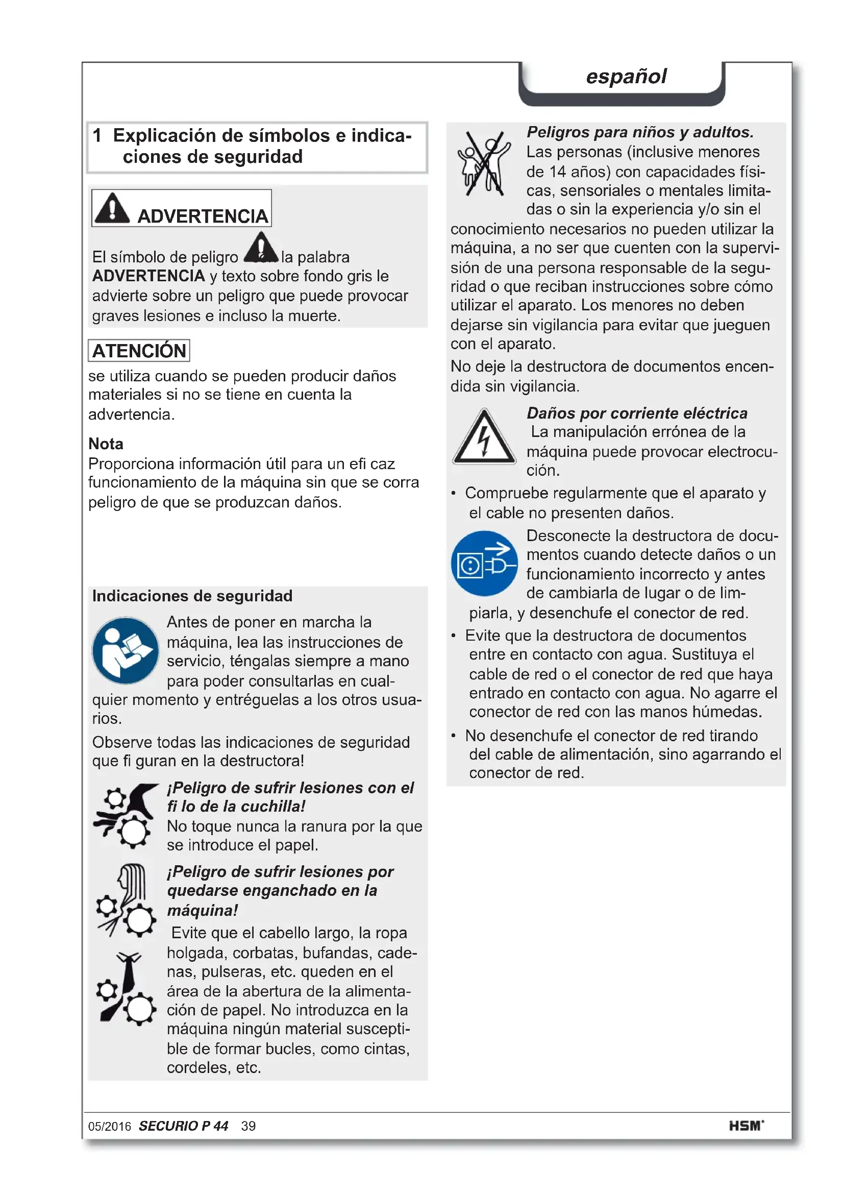 - Il numero massimo di fogli (DIN A4, 70 g/m² e 80 g/m²), introdotti longitudinalmente, che vengono tagliati in un unico passaggio. I risultati di capacità indicati vengono calcolati utilizzando un utensile da taglio nuovo e lubrifi cato e un motore freddo. Una tensione di rete più debole o una frequenza di rete diversa da quella indicata possono determi- nare una riduzione della capacità di taglio e un aumento del suono di scorrimento. La capacità di taglio può variare a seconda della struttura e delle caratteristiche della carta e dal tipo di immissione.05/2016 SECURIO P 44 39 español 1 Explicación de símbolos e indica- ciones de seguridad Nota Proporciona información útil para un efi caz funcionamiento de la máquina sin que se corra peligro de que se produzcan daños. ADVERTENCIA El símbolo de peligro con la palabra ADVERTENCIA y texto sobre fondo gris le advierte sobre un peligro que puede provocar graves lesiones e incluso la muerte. Indicaciones de seguridad Antes de poner en marcha la máquina, lea las instrucciones de servicio, téngalas siempre a mano para poder consultarlas en cual- quier momento y entréguelas a los otros usua- rios. Observe todas las indicaciones de seguridad que fi guran en la destructora! ¡Peligro de sufrir lesiones con el fi lo de la cuchilla! No toque nunca la ranura por la que se introduce el papel. ¡Peligro de sufrir lesiones por quedarse enganchado en la máquina! Evite que el cabello largo, la ropa holgada, corbatas, bufandas, cade- nas, pulseras, etc. queden en el área de la abertura de la alimenta- ción de papel. No introduzca en la máquina ningún material suscepti- ble de formar bucles, como cintas, cordeles, etc. Peligros para niños y adultos. Las personas (inclusive menores de 14 años) con capacidades físi- cas, sensoriales o mentales limita- das o sin la experiencia y/o sin el conocimiento necesarios no pueden utilizar la máquina, a no ser que cuenten con la supervi- sión de una persona responsable de la segu- ridad o que reciban instrucciones sobre cómo utilizar el aparato. Los menores no deben dejarse sin vigilancia para evitar que jueguen con el aparato. No deje la destructora de documentos encen- dida sin vigilancia. Daños por corriente eléctrica La manipulación errónea de la máquina puede provocar electrocu- ción.