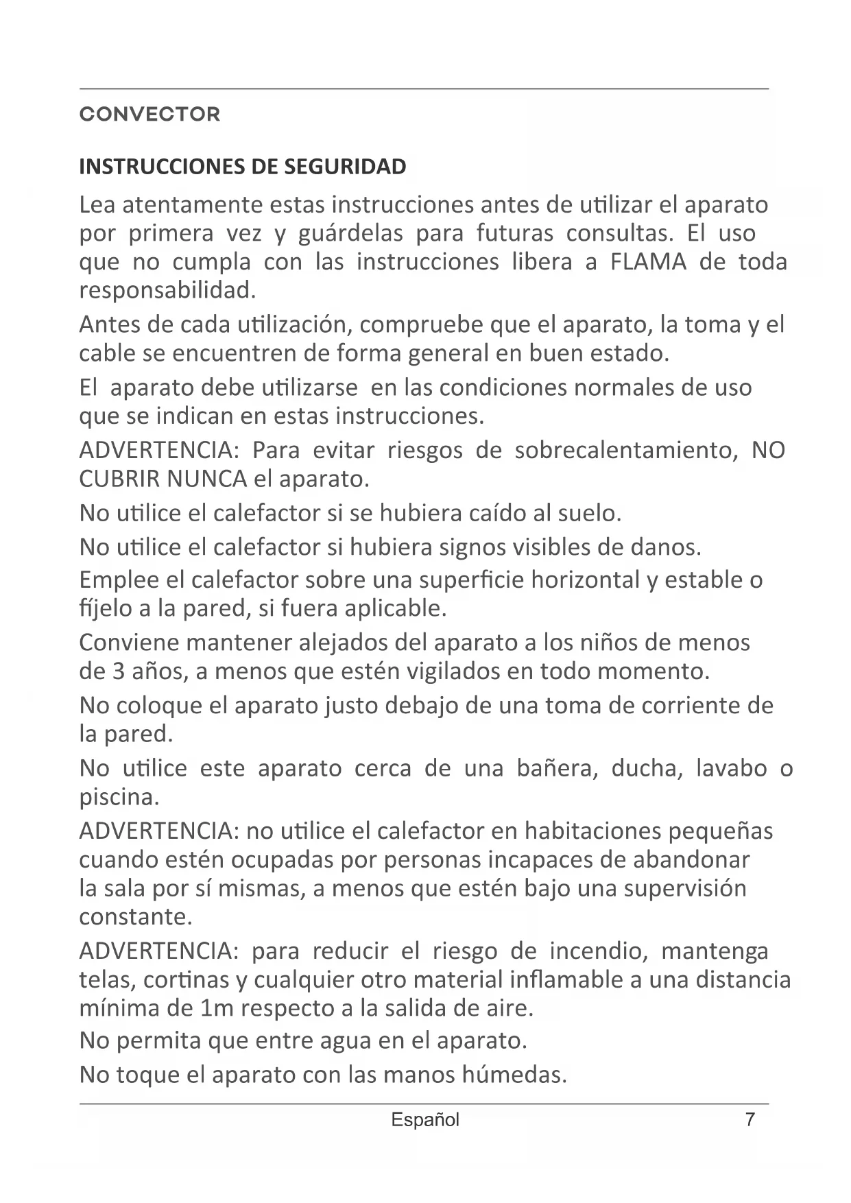 Lea atentamente estas instrucciones antes de ulizar el aparato por primera vez y guárdelas para futuras consultas. El uso que no cumpla con las instrucciones libera a FLAMA de toda responsabilidad. Antes de cada ulización, compruebe que el aparato, la toma y el cable se encuentren de forma general en buen estado. El aparato debe ulizarse en las condiciones normales de uso que se indican en estas instrucciones. ADVERTENCIA: Para evitar riesgos de sobrecalentamiento, NO CUBRIR NUNCA el aparato. No ulice el calefactor si se hubiera caído al suelo. No ulice el calefactor si hubiera signos visibles de danos. Emplee el calefactor sobre una supercie horizontal y estable o jelo a la pared, si fuera aplicable. Conviene mantener alejados del aparato a los niños de menos de 3 años, a menos que estén vigilados en todo momento. No coloque el aparato justo debajo de una toma de corriente de la pared. No ulice este aparato cerca de una bañera, ducha, lavabo o piscina. ADVERTENCIA: no ulice el calefactor en habitaciones pequeñas cuando estén ocupadas por personas incapaces de abandonar la sala por sí mismas, a menos que estén bajo una supervisión constante. ADVERTENCIA: para reducir el riesgo de incendio, mantenga telas, cornas y cualquier otro material inamable a una distancia mínima de 1m respecto a la salida de aire. No permita que entre agua en el aparato. No toque el aparato con las manos húmedas.8 www.ama.pt No introduzca nunca objetos dentro del aparato (p. ej.: agujas). Si el cable de alimentación esta dañado, debe ser reemplazado por el fabricante, su servicio de posventa o por personal cualicado a n de evitar cualquier peligro. Para las operaciones de ajuste y mantenimiento, consulte la guía de usuario suministrada con el aparato. Los niños de entre 3 y 8 años solo deben poner en marcha o detener el aparato si este se ha colocado o instalado en su posición de funcionamiento normal esperada y si se encuentran vigilados o se les ha explicado cómo ulizar el aparato con total seguridad y comprenden los danos que pueden derivarse de su uso. Los niños de entre 3 y 8 años no deben enchufar, ajustar ni limpiar el aparato, así como tampoco deben ocuparse de su mantenimiento. ATENCION: Algunas piezas de este producto pueden calentarse y provocar quemaduras. Hay que prestar especial atención en presencia de niños y personas vulnerables. Este aparato pueden ulizarlo niños de más de 8 años y personas con capacidades sicas, sensoriales o mentales reducidas, así como personas sin experiencia ni conocimientos siempre que se encuentren bajo la supervisión adecuada o hayan recibido instrucciones relavas a una ulización segura del aparato y hayan comprendido los riesgos que conlleva su manipulación. Los niños no han de jugar con el aparato. La limpieza y el mantenimiento que debe realizar el usuario no deben efectuarlos niños si no están bajo supervisión. Este producto cumple con las Direcvas de Compabilidad Electromagnéca y Baja Tensión. Este manual de instrucciones también está disponible en formato PDF en www.ama.pt.9 Español RECOMENDACIONES La instalación eléctrica de la pieza, la instalación del aparato y su uso deben cumplir con la normava vigente en su país. No ulice el aparato cerca de objetos y productos inamables y, en general, respete la distancia mínima de 50 cm entre el aparato y otros objetos (paredes, cornas, nebulizadores, etc.). El aparato debe colocarse de forma que se pueda acceder al enchufe eléctrico. No re del cable de alimentación ni del aparato, incluso cuando desee desconectar el enchufe de la toma de corriente. Nunca ulice el aparato inclinado o recostado sobre un lado. Este producto está desnado únicamente para uso domésco. En caso de uso profesional, inadecuado o incumplimiento de las instrucciones, el fabricante declina toda responsabilidad y la garana quedará anulada. Desenrolle completamente el cable antes de cada uso. No ulice un cable de extensión no adaptado a la potencia del aparato. No encienda el aparato en un lugar polvoriento o donde exista riesgo de incendio. DESCRIPCIÓN