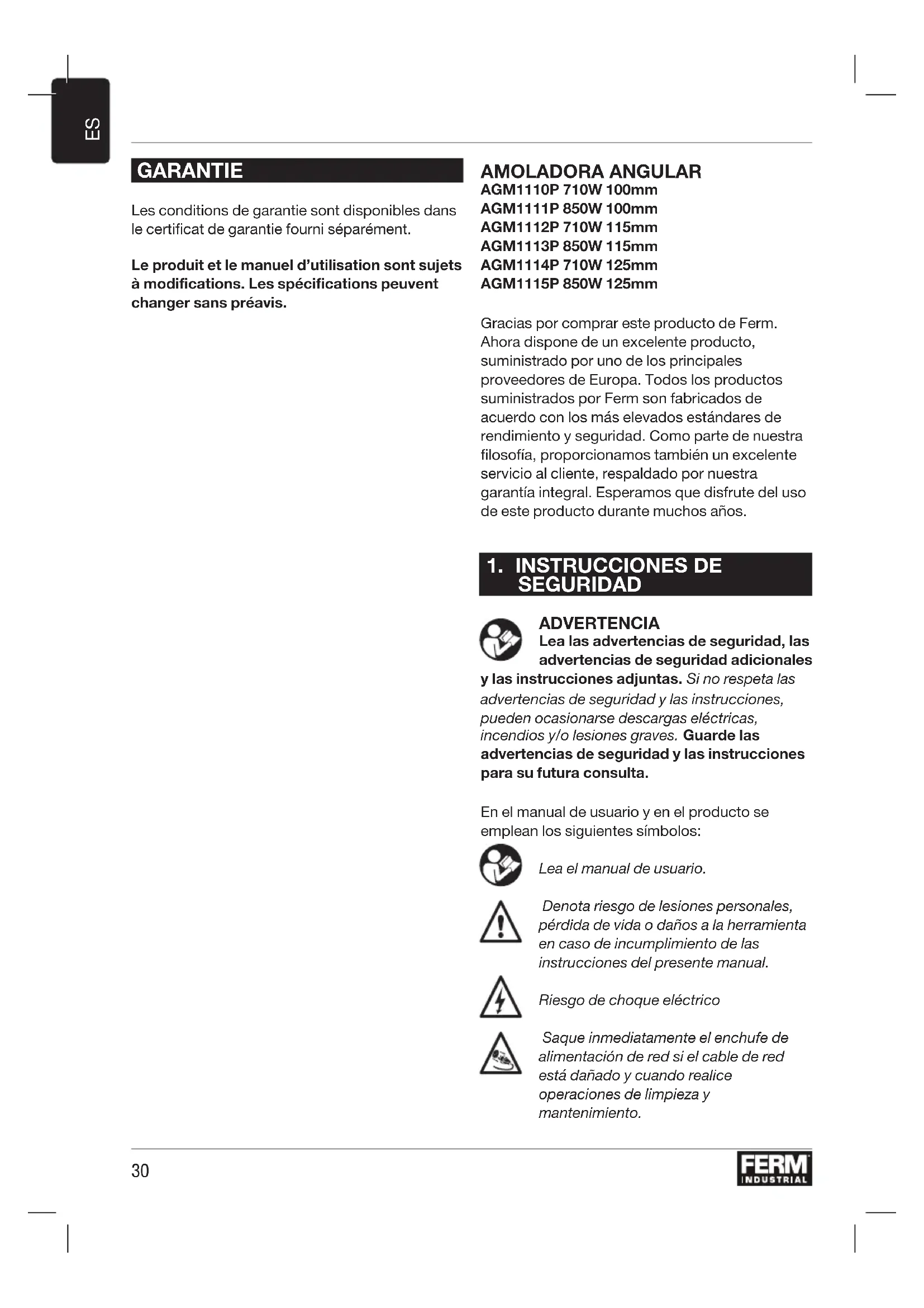 GARANTIE Les conditions de garantie sont disponibles dans le certificat de garantie fourni séparément. Le produit et le manuel d’utilisation sont sujets à modifications. Les spécifications peuvent changer sans préavis. AMOLADORA ANGULAR AGM1110P 710W 100mm AGM1111P 850W 100mm AGM1112P 710W 115mm AGM1113P 850W 115mm AGM1114P 710W 125mm AGM1115P 850W 125mm Gracias por comprar este producto de Ferm. Ahora dispone de un excelente producto, suministrado por uno de los principales proveedores de Europa. Todos los productos suministrados por Ferm son fabricados de acuerdo con los más elevados estándares de rendimiento y seguridad. Como parte de nuestra filosofía, proporcionamos también un excelente servicio al cliente, respaldado por nuestra garantía integral. Esperamos que disfrute del uso de este producto durante muchos años.