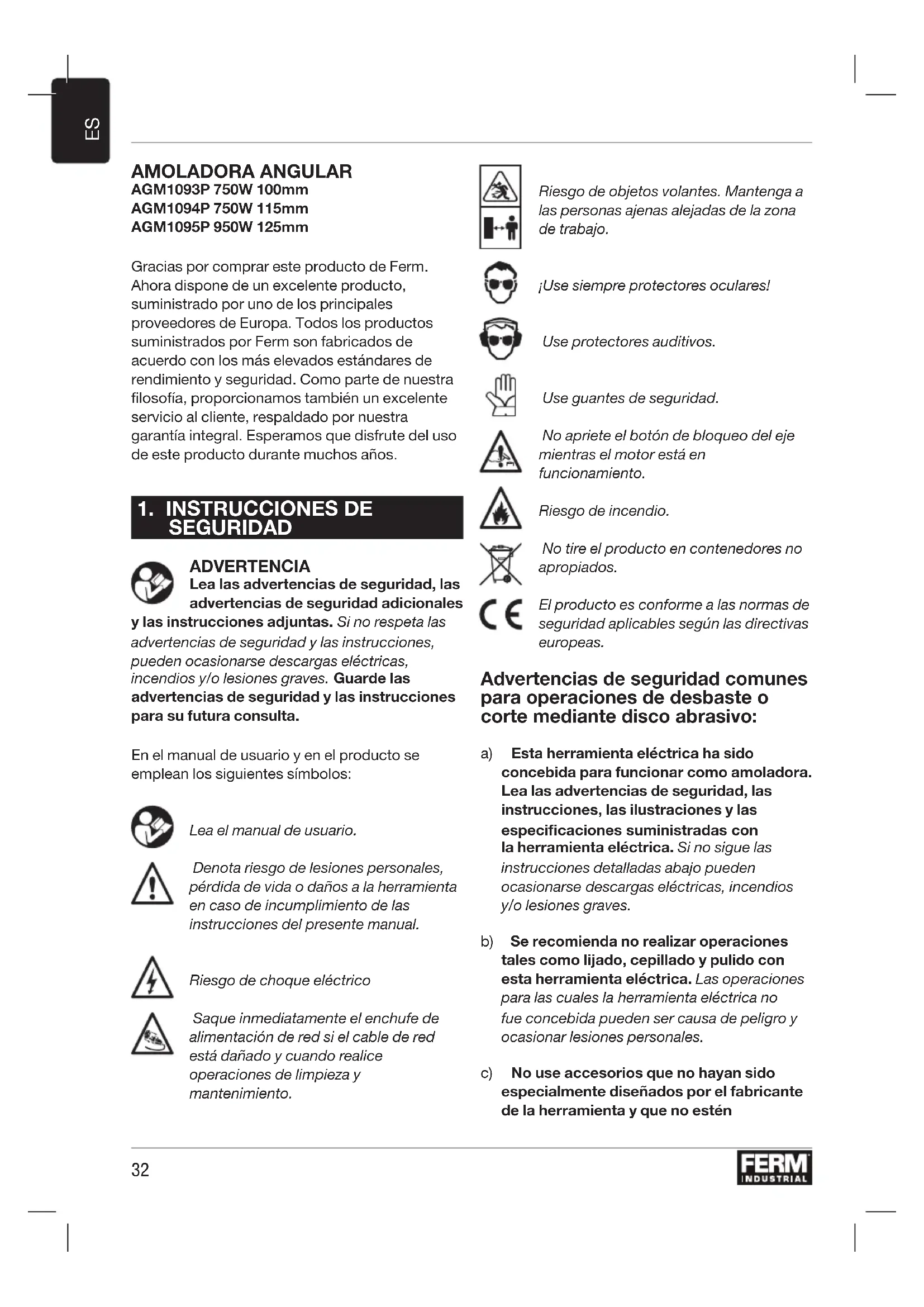 AMOLADORA ANGULAR AGM1093P 750W 100mm AGM1094P 750W 115mm AGM1095P 950W 125mm Gracias por comprar este producto de Ferm. Ahora dispone de un excelente producto, suministrado por uno de los principales proveedores de Europa. Todos los productos suministrados por Ferm son fabricados de acuerdo con los más elevados estándares de rendimiento y seguridad. Como parte de nuestra filosofía, proporcionamos también un excelente servicio al cliente, respaldado por nuestra garantía integral. Esperamos que disfrute del uso de este producto durante muchos años.