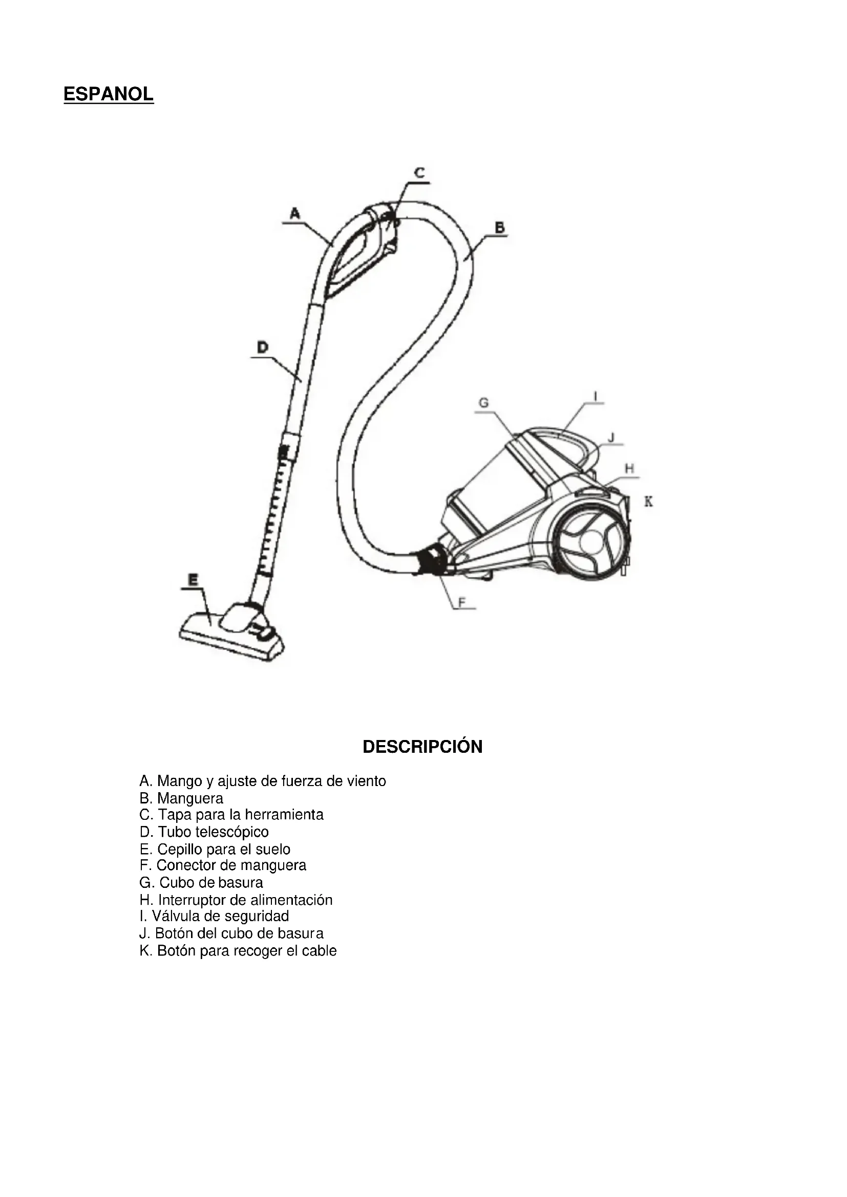 D. Tubo telescópico E. Cepillo para el suelo F. Conector de manguera