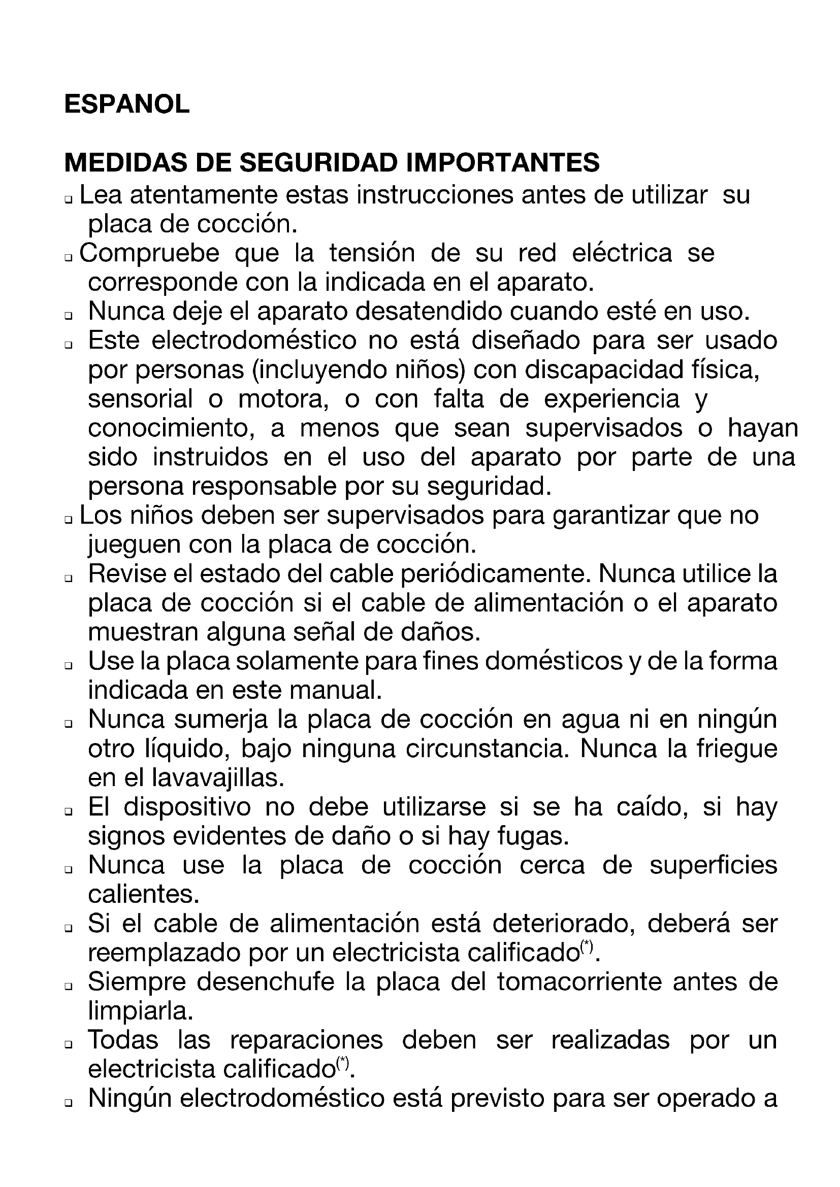 q Lea atentamente estas instrucciones antes de utilizar su placa de cocción. q Compruebe que la tensión de su red eléctrica se corresponde con la indicada en el aparato. q Nunca deje el aparato desatendido cuando esté en uso. q Este electrodoméstico no está diseñado para ser usado por personas (incluyendo niños) con discapacidad física, sensorial o motora, o con falta de experiencia y conocimiento, a menos que sean supervisados o hayan sido instruidos en el uso del aparato por parte de una persona responsable por su seguridad. q Los niños deben ser supervisados para garantizar que no jueguen con la placa de cocción. q Revise el estado del cable periódicamente. Nunca utilice la placa de cocción si el cable de alimentación o el aparato muestran alguna señal de daños. q Use la placa solamente para fines domésticos y de la forma indicada en este manual. q Nunca sumerja la placa de cocción en agua ni en ningún otro líquido, bajo ninguna circunstancia. Nunca la friegue en el lavavajillas. q El dispositivo no debe utilizarse si se ha caído, si hay signos evidentes de daño o si hay fugas. q Nunca use la placa de cocción cerca de superficies calientes. q Si el cable de alimentación está deteriorado, deberá ser reemplazado por un electricista calificado