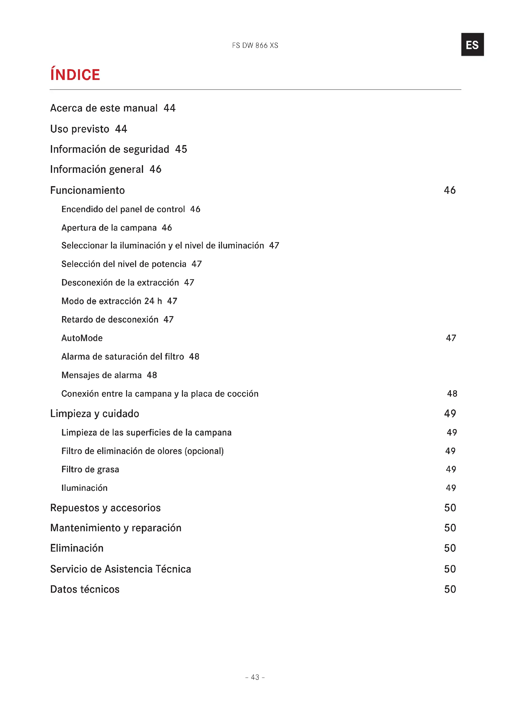 ÍNDICE Acerca de este manual 44 Uso previsto 44 Información de seguridad 45 Información general 46 Funcionamiento 46 Encendido del panel de control 46 Apertura de la campana 46 Seleccionar la iluminación y el nivel de iluminación 47 Selección del nivel de potencia 47 Desconexión de la extracción 47 Modo de extracción 24 h 47 Retardo de desconexión 47 AutoMode 47 Alarma de saturación del filtro 48 Mensajes de alarma 48 Conexión entre la campana y la placa de cocción 48 Limpieza y cuidado 49 Limpieza de las superficies de la campana 49 Filtro de eliminación de olores (opcional) 49 Filtro de grasa 49 Iluminación 49 Repuestos y accesorios 50 Mantenimiento y reparación 50 Eliminación 50 Servicio de Asistencia Técnica 50 Datos técnicos 50FS DW 866 XS – 44 –