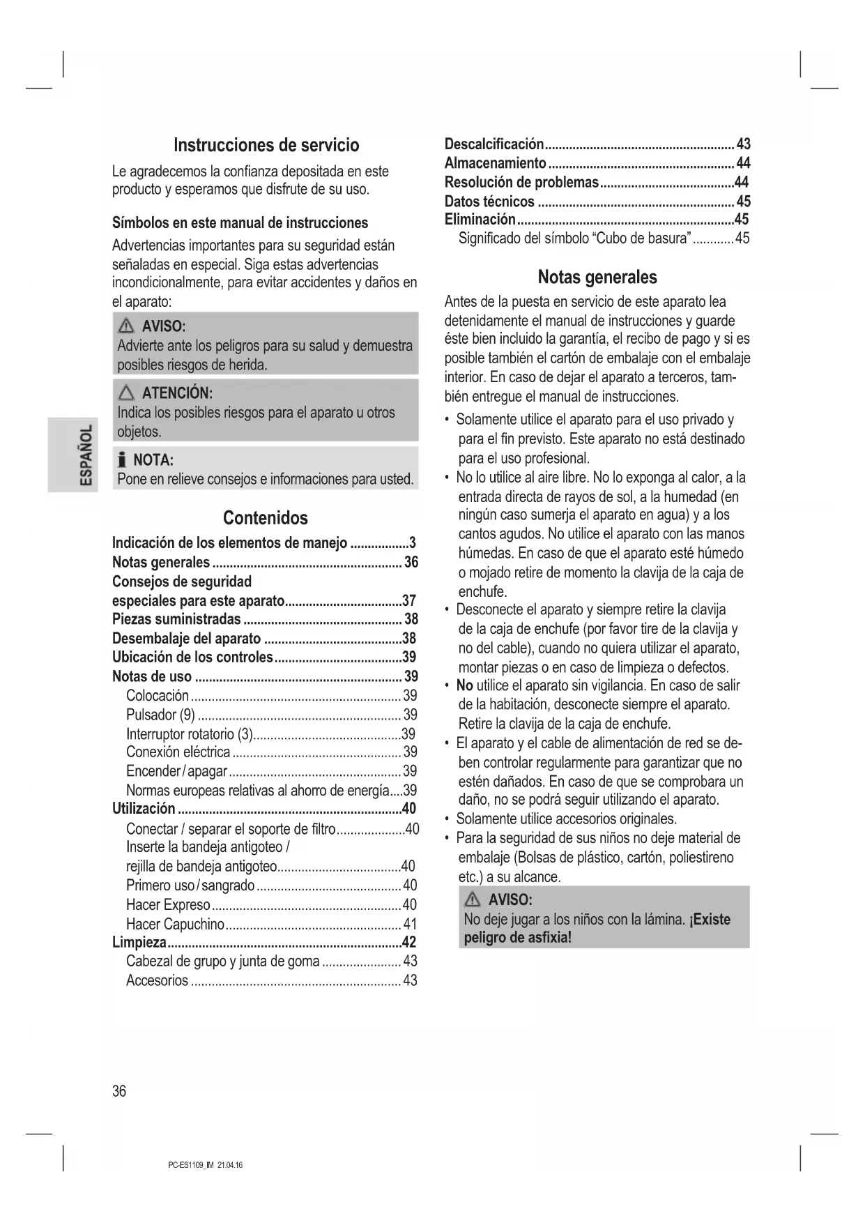 - Para la seguridad de sus niños no deje material de embalaje (Bolsas de plástico, cartón, poliestireno etc.) a su alcance. AVISO: No deje jugar a los niños con la lámina. ¡Existe peligro de asxia!37 PC-ES1109_IM 21.04.16 Consejos de seguridad especiales para este aparato AVISO: ¡Riesgo de quemaduras! El cabezal de grupo, soporte del ltro, boquilla de vapor y bandeja de tazas se calientan mucho durante el funcionamiento.