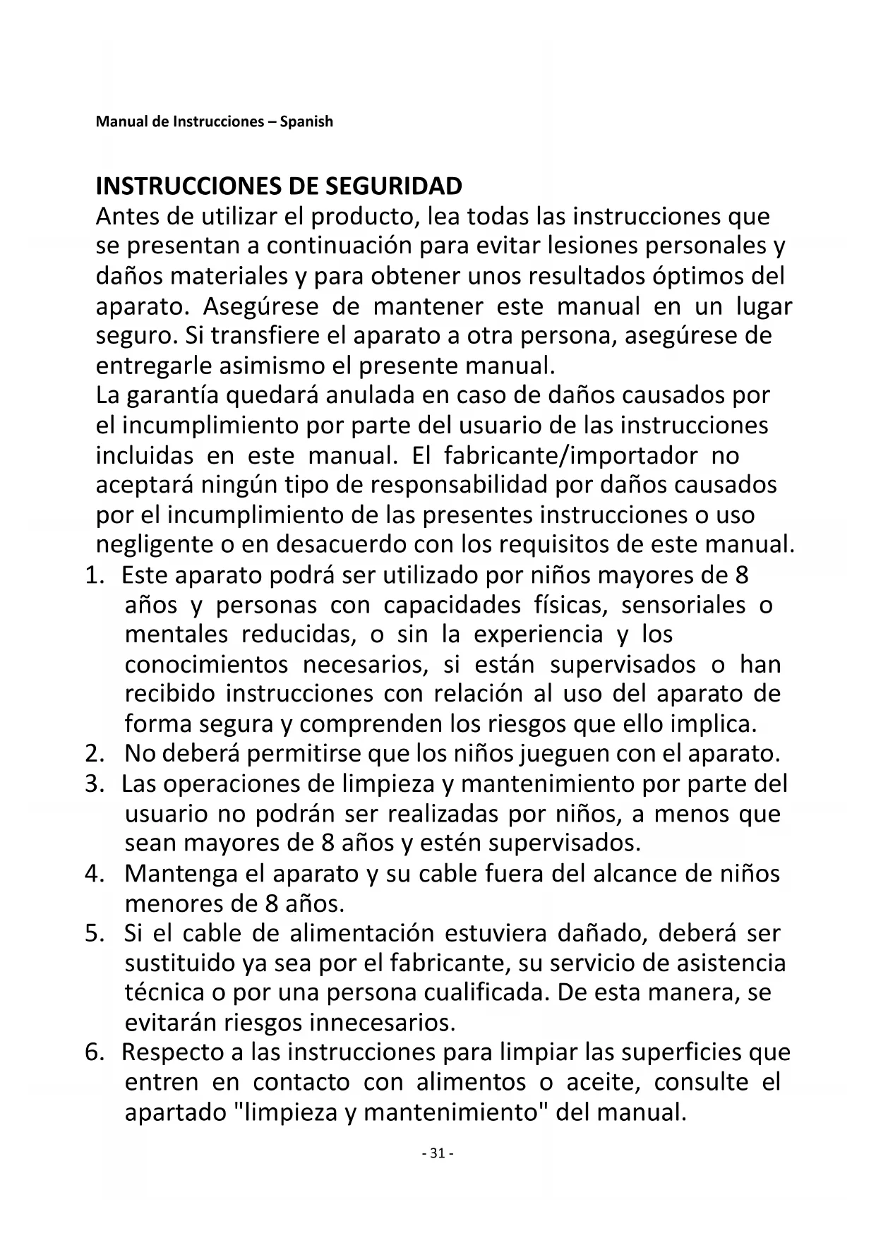 Antes de utilizar el producto, lea todas las instrucciones que se presentan a continuación para evitar lesiones personales y daños materiales y para obtener unos resultados óptimos del aparato. Asegúrese de mantener este manual en un lugar seguro. Si transfiere el aparato a otra persona, asegúrese de entregarle asimismo el presente manual. La garantía quedará anulada en caso de daños causados por el incumplimiento por parte del usuario de las instrucciones incluidas en este manual. El fabricante/importador no aceptará ningún tipo de responsabilidad por daños causados por el incumplimiento de las presentes instrucciones o uso negligente o en desacuerdo con los requisitos de este manual.