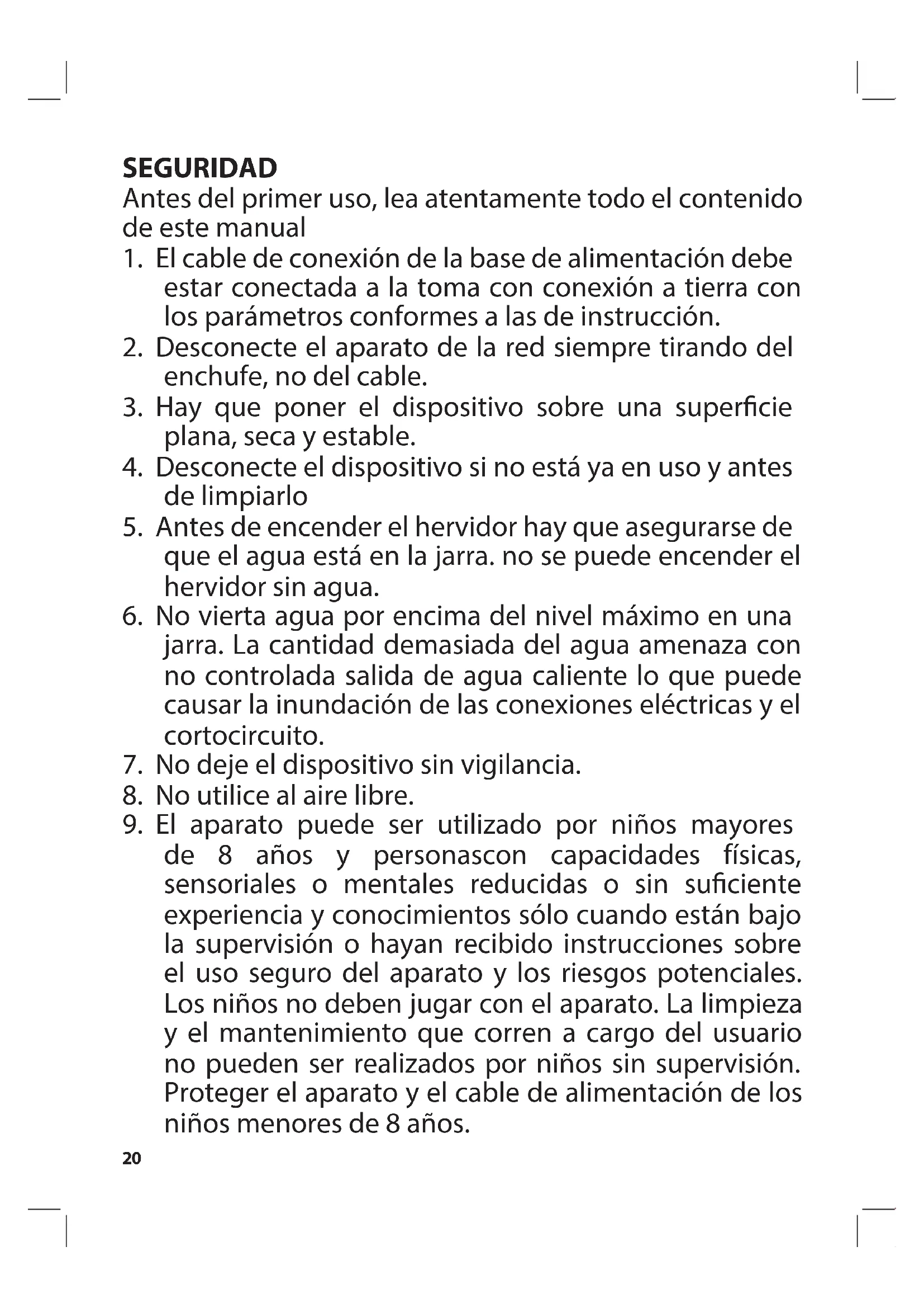 - Sólo se puede limpiar el dispositivo que está frío y desconectado. - Durante el lavado no se puede sumergir la jarra en agua. - Se puede limpiar los supercies exteriores con un paño húmedo y un líquido para lavar platos. - Los sedimentos del agua en las supercies internas se deberá retirar con un paño empapado en vinagre, luego enjuague la jarra con agua limpia. - En el caso de la deposición de sarro en el elemento de calentamiento se debe retirarlo periódicamente de la siguiente manera: - Hervir en la jarra - 0,5 litros de agua. - Apagar el jarro y desconectar la enchufe del contacto. - Verter a una jarra 0,1 l de vinagre y dejar la disolución durante unas pocas horas. - Verter la disolución, enjuagar el hervidor con agua limpia. - Hervir en el hervidor 1 litro de agua. - Verter el agua hirviendo y enjuagar el interior de la jarra con agua limpia.24