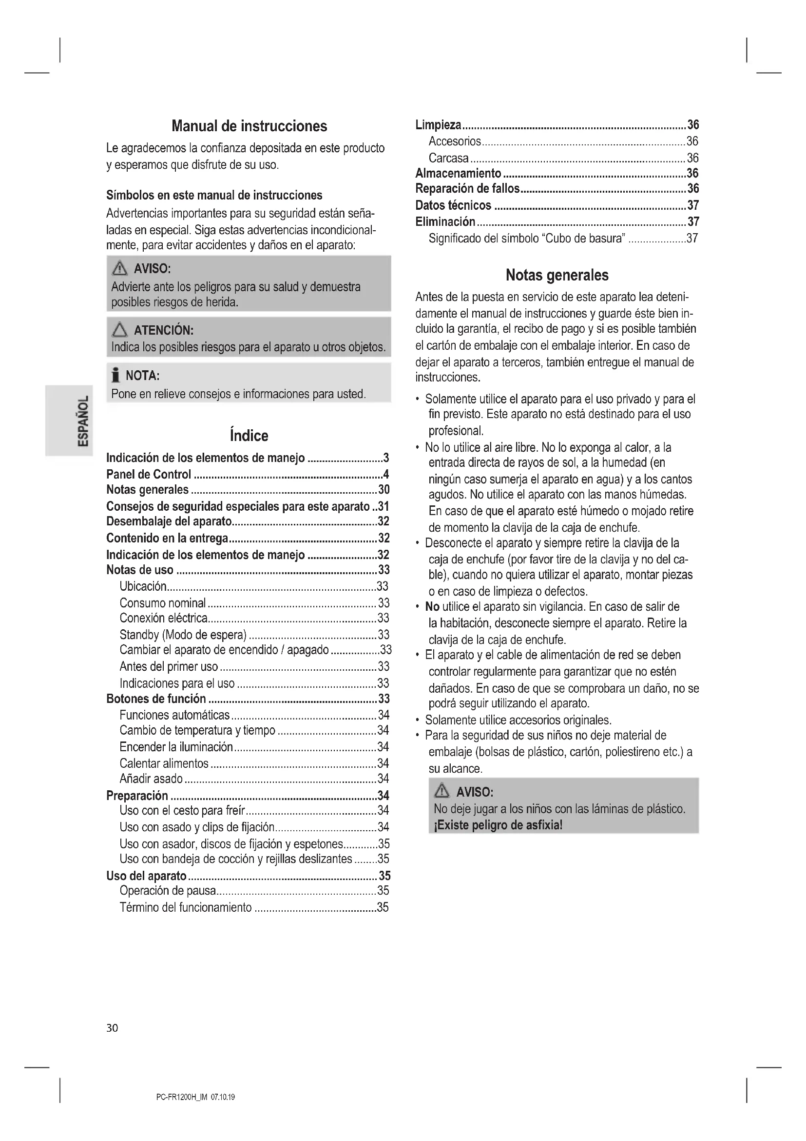 dispositivo. Devuélvalo inmediatamente al vendedor. Contenido en la entrega 1 × Freidora por aire caliente 1 × Cesto para freír con tapa 1 × Herramienta de extracción 2 × Clips de retención 1 × Asador 2 × Discos de fijación para espetones 8 × Espetones 1 × Bandeja de cocción / bandeja para grasa 2 × Rejilla deslizante Indicación de los elementos de manejo Imagen A, página 3 1 Apertura de entrada de aire 2 Pantalla 3 Apertura de salida de aire 4 Carcasa 5 Puerta 6 Manilla de la puerta 7 Liberación 8 Raíl de guía 9 Soporte para asado / cesto para freír 10 Panel de control 11 Cesto para freír 11a Tapa 12 Herramienta de extracción 13 Clips de retención 14 Asador 15 Discos de jación para espetones 16 Espetones 17 Bandeja de cocción / bandeja para grasa 18 Rejilla deslizante Imagen B, página 4: Símbolos del panel de control 19 Botones para selección de programa 20 Botones y para conguración de tiempo ( ) 21 Botón (Cambiar el aparato de encendido / apagado) 22 Botón (Añadir asado) 23 Botón (Calentar alimentos) 24 Botón (Encender la iluminación) 25 Botones y para conguración de temperatura ( )PC-FR1200H_IM 07.10.19