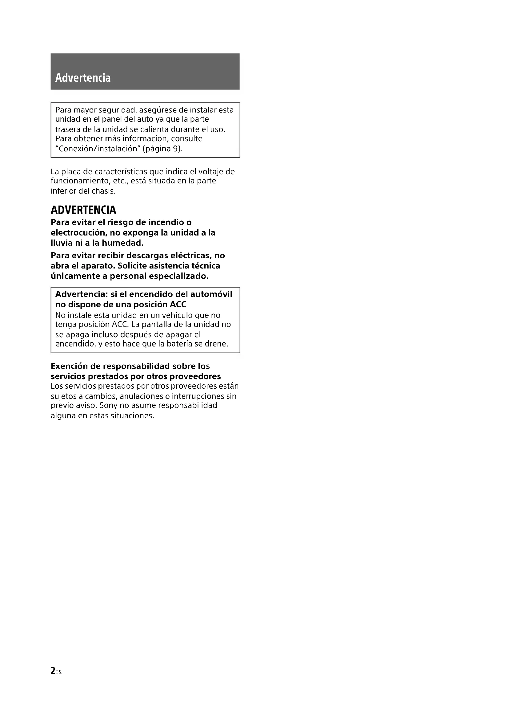 eçu cette information. Veuillez noter que Sony n’est pas en mesure de répond re aux questions concernant le contenu du code source.2ES La placa de características que indica el voltaje de funcionamiento, etc., está situada en la parte inferior del chasis. ADVERTENCIA Para evitar el riesgo de incendio o electrocución, no exponga la unidad a la lluvia ni a la humedad. Para evitar recibir descargas eléctricas, no abra el aparato. Solicite asistencia técnica únicamente a personal especializado. Exención de responsabilidad sobre los servicios prestados por otros proveedores Los servicios prestados por otros proveedores están sujetos a cambios, anulaciones o interrupciones sin previo aviso. Sony no asume responsabilidad alguna en estas situaciones. Advertencia Para mayor seguridad, asegúrese de instalar esta unidad en el panel del auto ya que la parte trasera de la unidad se calienta durante el uso. Para obtener más información, consulte “Conexión/instalación” (página 9). Advertencia: si el encendido del automóvil no dispone de una posición ACC No instale esta unidad en un vehículo que no tenga posición ACC. La pantalla de la unidad no se apaga incluso después de apagar el encendido, y esto hace que la batería se drene.3ES Precaución EN NINGÚN CASO SONY PODRÁ SER CONSIDERADO RESPONSABLE POR CUALQUIER DAÑO CASUAL, INDIRECTO O CONSECUENTE, NI POR OTROS DAÑOS INCLUIDO, PERO SIN LIMITARSE A, LA PÉRDIDA DE BENEFICIOS, LA PÉRDIDA DE INGRESOS, LA PÉRDIDA DE DATOS, LA PÉRDIDA DE USO DEL PRODUCTO NI DE CUALQUIER MATERIAL ASOCIADO, EL TIEMPO DE