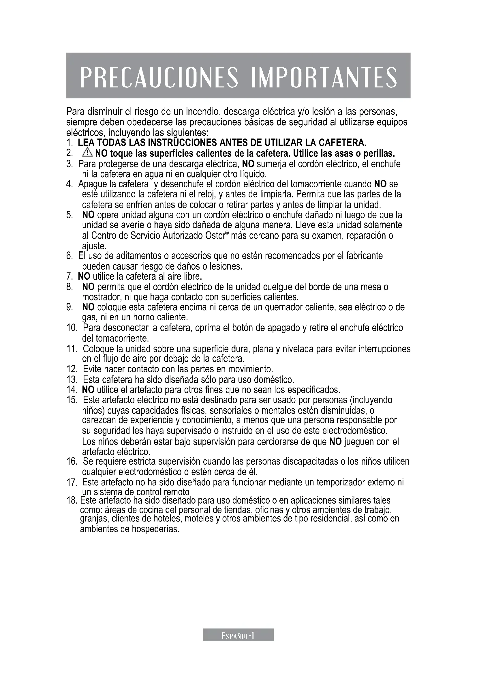 9. NO coloque esta cafetera encima ni cerca de un quemador caliente, sea eléctrico o de