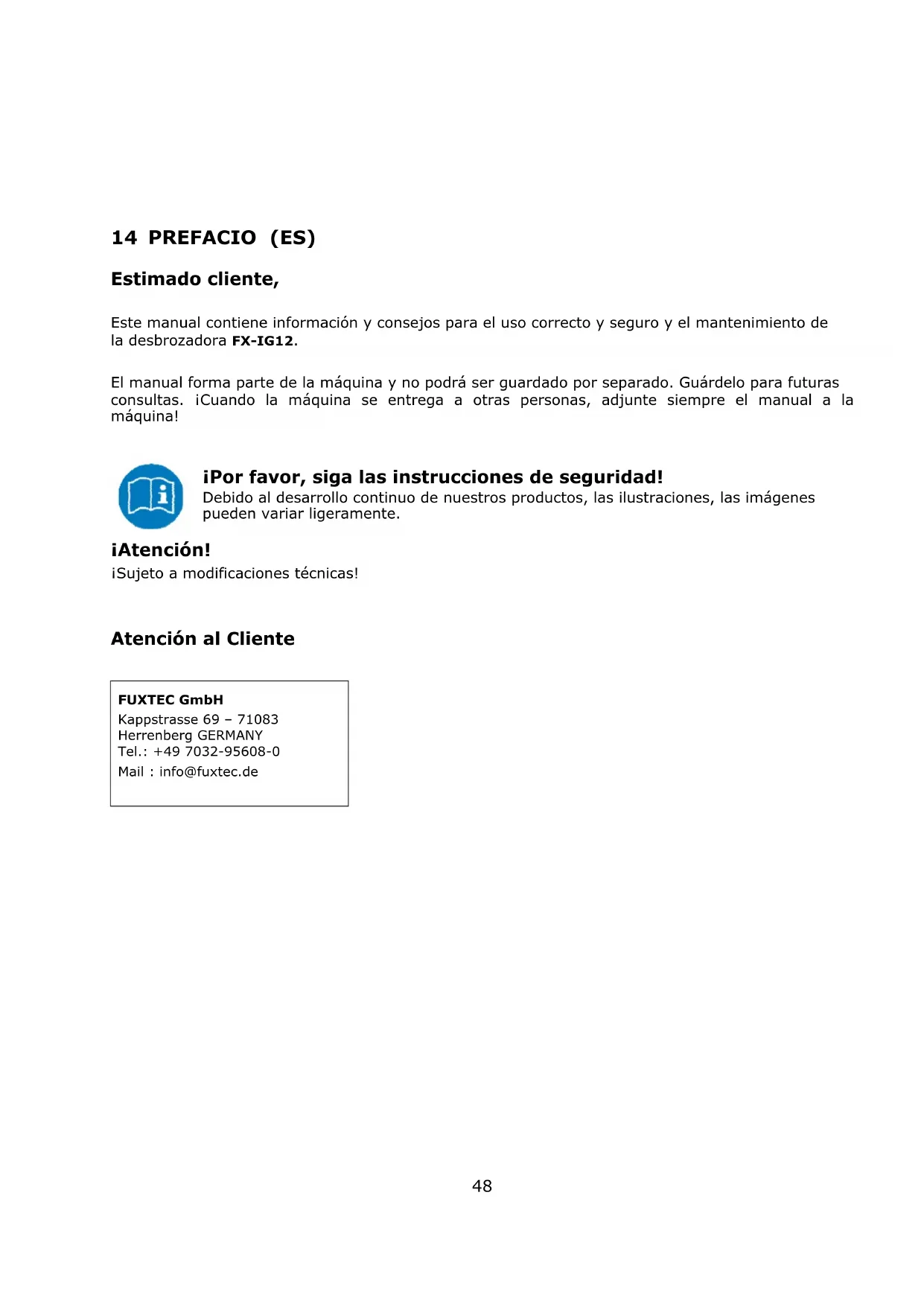 14 PREFACIO (ES) Estimado cliente, Este manual contiene información y consejos para el uso correcto y seguro y el mantenimiento de la desbrozadora FX-IG12. El manual forma parte de la máquina y no podrá ser guardado por separado. Guárdelo para futuras consultas. ¡Cuando la máquina se entrega a otras personas, adjunte siempre el manual a la máquina!