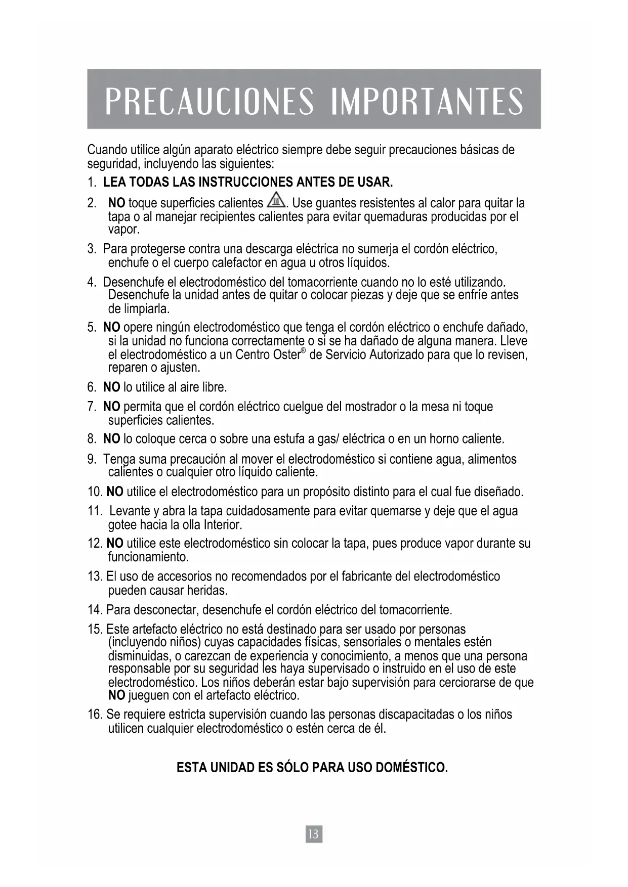 utilicen cualquier electrodoméstico o estén cerca de él. ESTA UNIDAD ES SÓLO PARA USO DOMÉSTICO.14