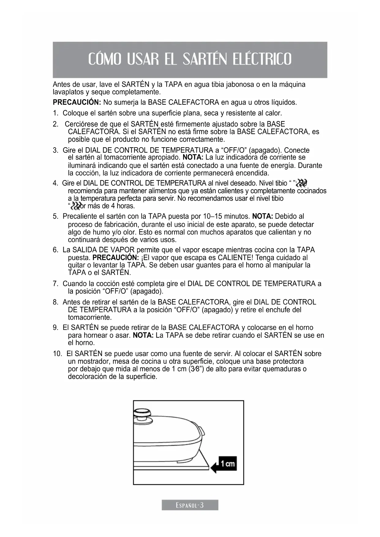 8Español-3 CÓMO USAR EL SARTÉN ELÉCTRICO Antes de usar, lave el SARTÉN y la TAPA en agua tibia jabonosa o en la máquina lavaplatos y seque completamente. pRecauciÓn: No sumerja la BASE CALEFACTORA en agua u otros líquidos.