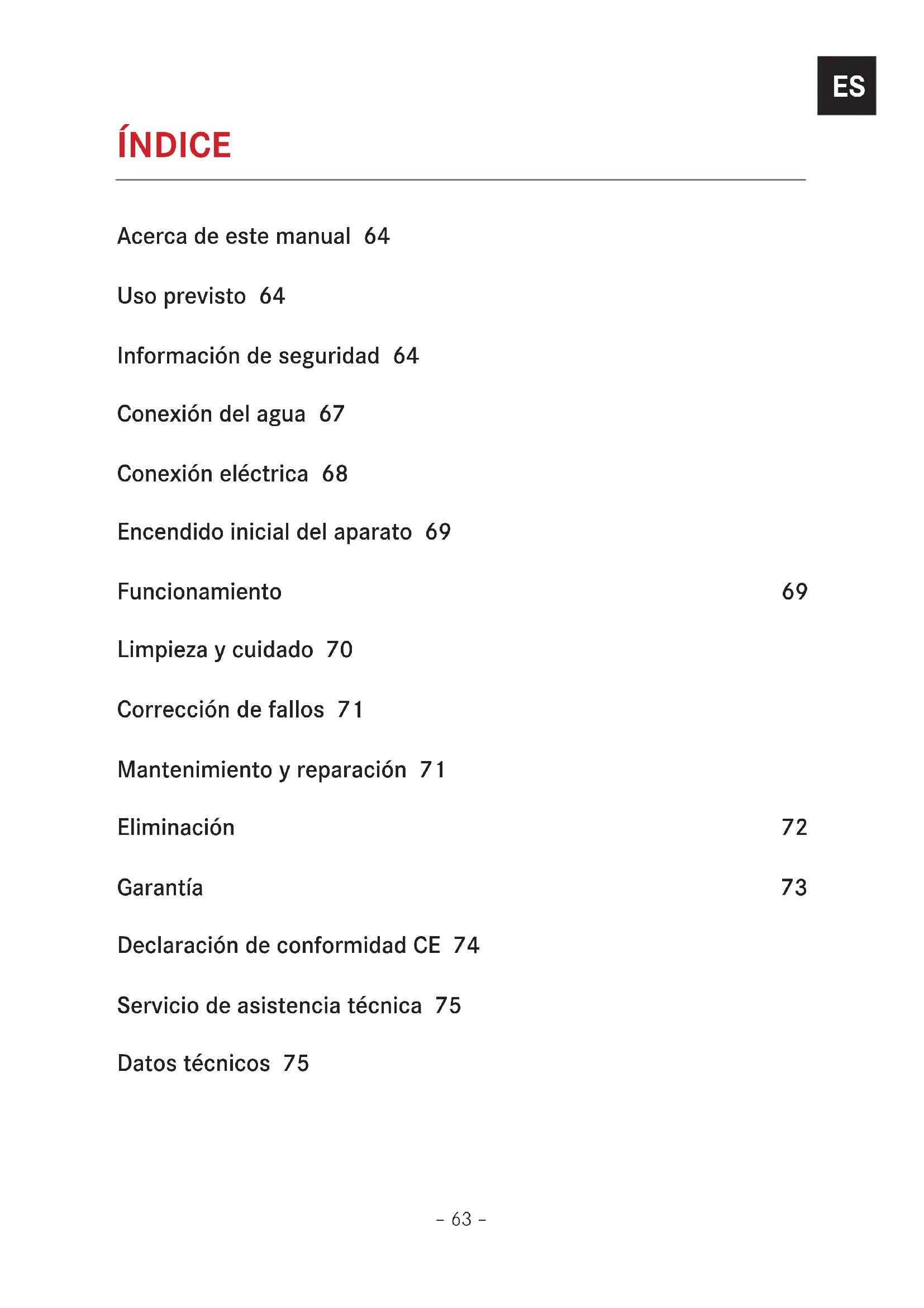 ÍNDICE Acerca de este manual 64 Uso previsto 64 Información de seguridad 64 Conexión del agua 67 Conexión eléctrica 68 Encendido inicial del aparato 69 Funcionamiento 69 Limpieza y cuidado 70 Corrección de fallos 71 Mantenimiento y reparación 71 Eliminación 72 Garantía 73 Declaración de conformidad CE 74 Servicio de asistencia técnica 75 Datos técnicos 75– 64 –