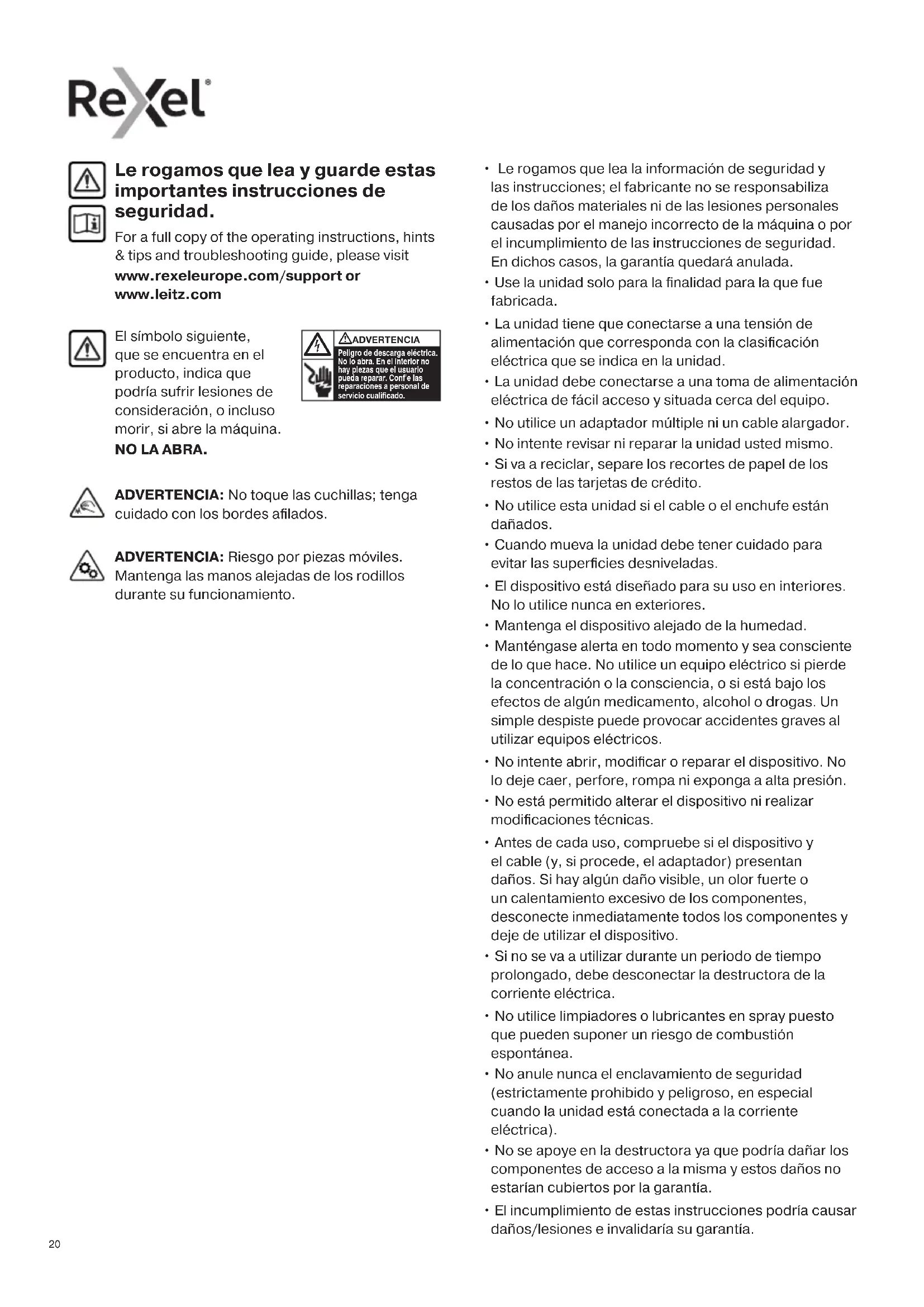 - El incumplimiento de estas instrucciones podría causar daños/lesiones e invalidaría su garantía. Le rogamos que lea y guarde estas importantes instrucciones de seguridad. For a full copy of the operating instructions, hints & tips and troubleshooting guide, please visit www.rexeleurope.com/support or www.leitz.com ADVERTENCIA: No toque las cuchillas; tenga cuidado con los bordes afilados. ADVERTENCIA: Riesgo por piezas móviles. Mantenga las manos alejadas de los rodillos durante su funcionamiento.212121 Mantenga alejadas las joyas sueltas Mantenga alejadas las corbatas y las prendas sueltas Símbolos de advertencia Mantenga alejado el cabello largo No introduzca las manos en la ranura de entrada Símbolos de advertencia Capacidad de hojas No introduzca CDs No introduzca grapas de gran tamaño (mayores de 26 mm) Advertencia: piezas móviles Este equipo no ha sido diseñado para su uso por parte de niños No utilice aerosoles cerca de la unidad. No utilice limpiadores o lubricantes en spray puesto que pueden suponer un riesgo de combustión espontánea. Icono Tipo Interruptor deslizante / indicador y acción Botones de control Botón de inicio automático y modo de espera (pulsar una vez) Retroceso (deslizar a la posición) Avance (deslizar a la posición) Indicador de sobrecalentamiento (deje que la destructora se enfríe) Indicador de sobrecarga / Indicador de atasco (reduzca el número de hojas / elimine el atasco) Modelos con botones pulsadores Icono Tipo Interruptor deslizante / indicador y acción Interruptor deslizante Inicio automático (deslizar a la posición para empezar a destruir) Retroceso (deslizar a la posición) Avance (deslizar a la posición) Indicadores de estado Apagado (deslizar a la posición) Indicador de destructora preparada (asegúrese de que el cabezal está sobre el recipiente y que el interruptor se encuentra en la posición de inicio automático) Indicador de sobrecalentamiento (deje que la destructora se enfríe) Controles e indicadores Modelos con interruptor deslizante No introduzca tarjetas de crédito Accesorios Utilice únicamente accesorios Rexel: Hojas lubricantes (20) - 2101949 Hojas lubricantes (12) - 210194822 Papel grueso o cartulina < 200 gsm. Varias hojas dobladas (hojas de tamaño A3 dobladas por la mitad). Papel satinado u hojas impresas por ambas caras. CDs y DVDs No utilice aerosoles Sin aceite, solo láminas de aceite Capacidad de destrucción PUEDE destruir lo siguiente: