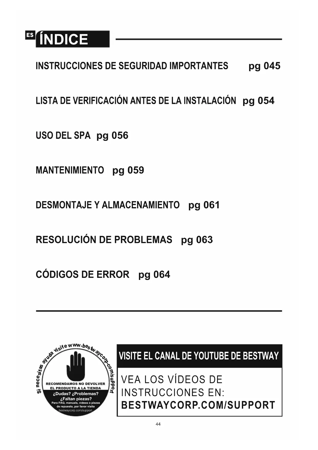 - Recomendado para proteger el spa de la exposición directa a la luz solar por una cubierta cuando no esté en uso. ADVERTENCIA PRCD ADVERTENCIA: antes de insertar el enchufe en una toma de corriente, asegúrese de que la tasa de corriente de la toma es adecuada para la bomba. ADVERTENCIA: utilizar un alargador o un adaptador multienchufe con el calentador del spa puede provocar el sobrecalentamiento del enchufe, causando daños al equipo y los elementos circundantes. El spa es un electrodoméstico de clase I y debe conectarse directamente a una toma de corriente con conexión a tierra. Se recomienda usar una única toma de corriente resistente a la humedad y con capacidad para cargas de alta potencia. Revise el enchufe y la toma de corriente con regularidad para comprobar si hay señales de daños antes de utilizar el spa; no lo utilice si el enchufe o la toma están dañados. Si tiene dudas sobre la calidad del suministro eléctrico, consulte a un electricista cualificado antes de utilizar el spa. ADVERTENCIA: el enchufe de PRCD debe probarse antes de cada uso para evitar el riesgo de descarga eléctrica. ADVERTENCIA: no utilice la bomba si la prueba falla. Para recibir asistencia, visite la sección de soporte de nuestro sitio web: www.bestwaycorp.com. ÍNDICE
