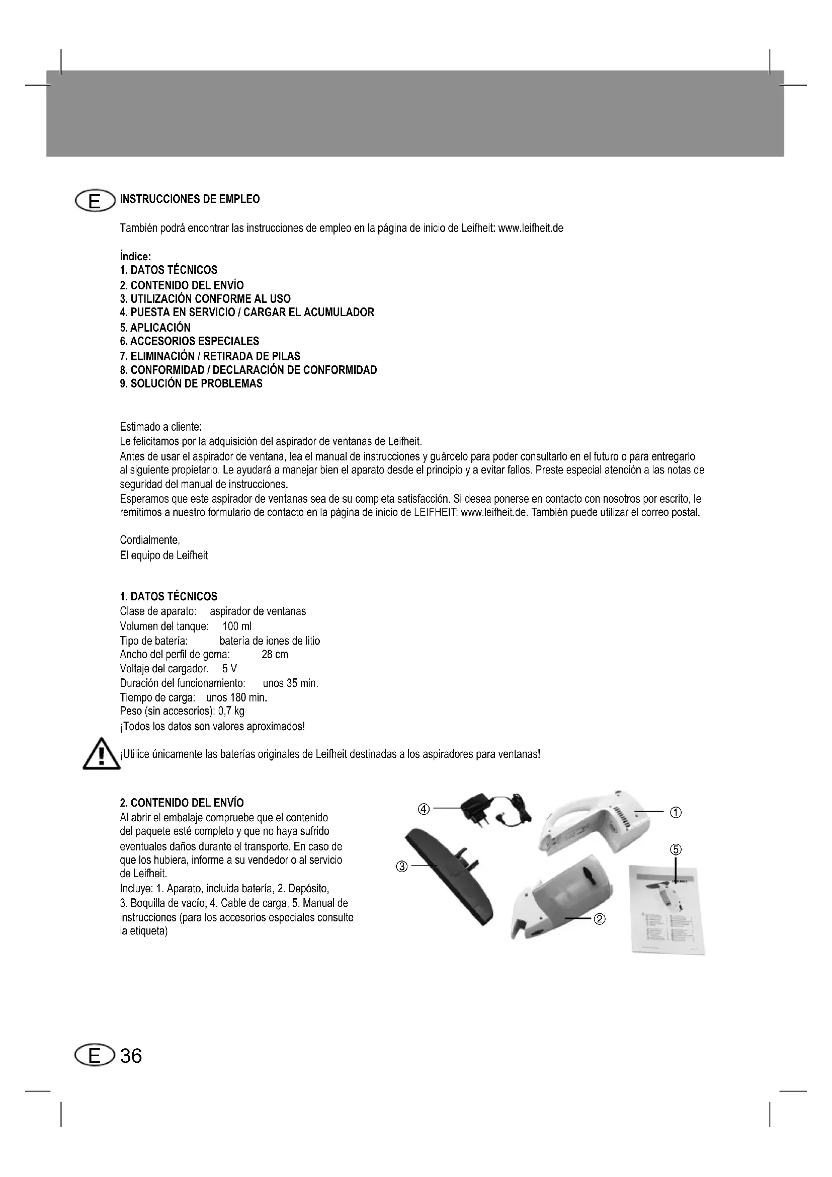 2.CONTENIDODELENVÍO Al abrir el embalaje compruebe que el contenido del paquete esté completo y que no haya sufrido eventuales daños durante el transporte. En caso de que los hubiera, informe a su vendedor o al servicio de Leifheit. Incluye:1.Aparato,incluidabatería,2.Depósito, 3.Boquilladevacío,4.Cabledecarga,5.Manualde instrucciones (para los accesorios especiales consulte la etiqueta)37