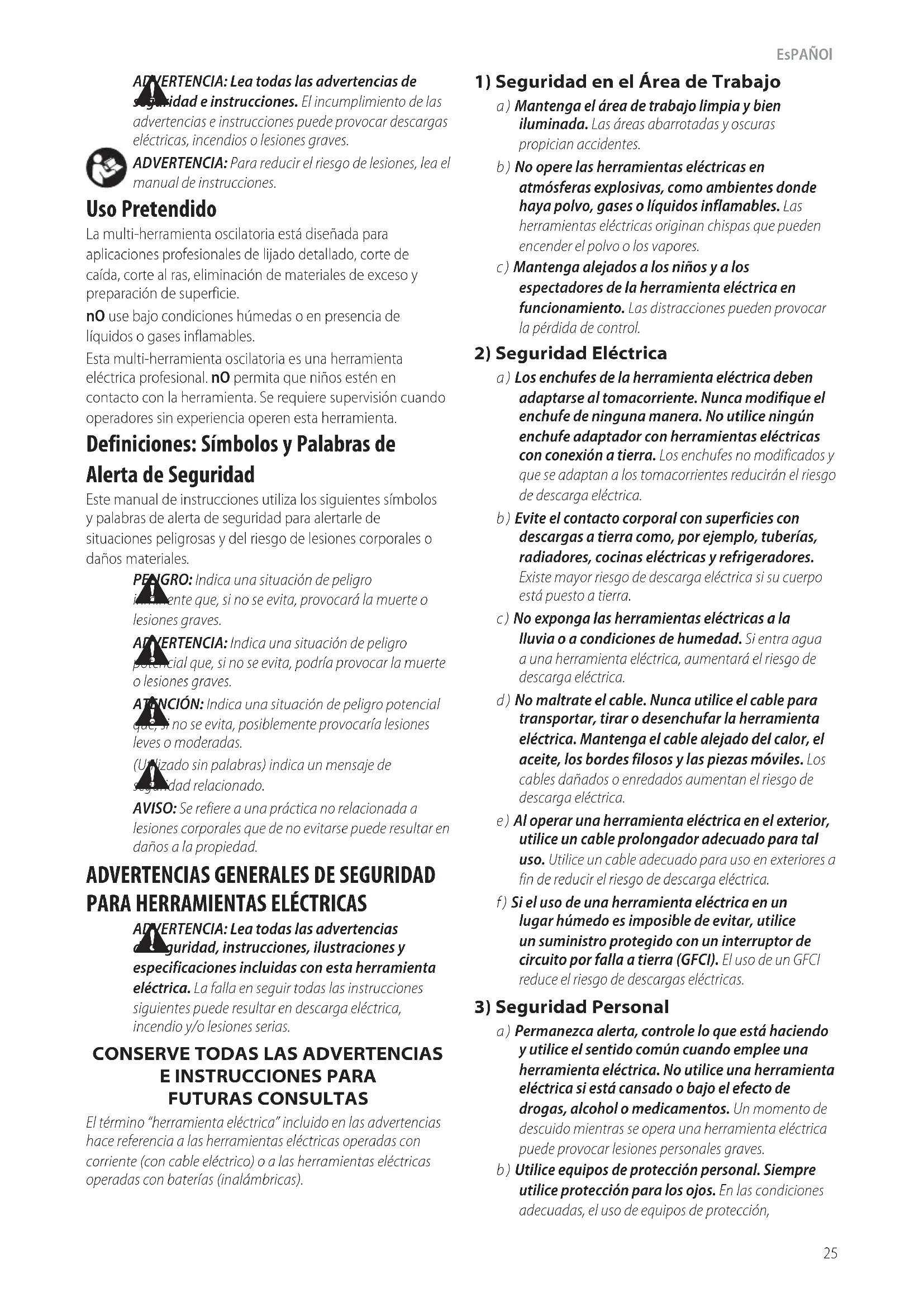 FUTURAS CONSULTAS El término “herramienta eléctrica” incluido en las advertencias hace referencia a las herramientas eléctricas operadas con corriente (con cable eléctrico) o a las herramientas eléctricas operadas con baterías (inalámbricas). Definiciones: Símbolos y Palabras de Alerta de Seguridad Este manual de instrucciones utiliza los siguientes símbolos y palabras de alerta de seguridad para alertarle de situaciones peligrosas y del riesgo de lesiones corporales o dañosmateriales.