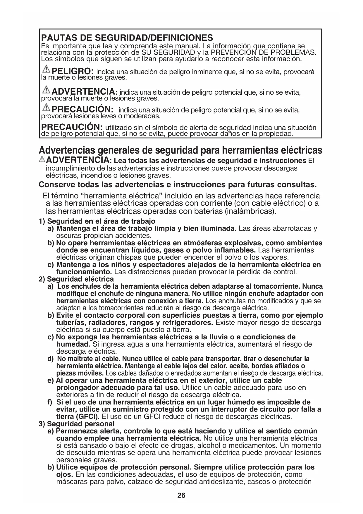 Es importante que lea y comprenda este manual. La información que contiene se relaciona con la protección de SU SEGURIDAD y la PREVENCIÓN DE PROBLEMAS. Los símbolos que siguen se utilizan para ayudarlo a reconocer esta información. PELIGRO: indica una situación de peligro inminente que, si no se evita, provocará la muerte o lesiones graves. ADVERTENCIA: indica una situación de peligro potencial que, si no se evita, provocará la muerte o lesiones graves. PRECAUCIÓN: indica una situación de peligro potencial que, si no se evita, provocará lesiones leves o moderadas. PRECAUCIÓN: utilizado sin el símbolo de alerta de seguridad indica una situación de peligro potencial que, si no se evita, puede provocar daños en la propiedad.27 auditiva, reducirá las lesiones personales. c) Evite el encendido por accidente. Asegúrese de que el interruptor esté en la posición de apagado antes de conectarlo a la fuente de energía o paquete de baterías, o antes de levantar o transportar la herramienta. Transportar herramientas eléctricas con el dedo apoyado en el interruptor o enchufar herramientas eléctricas con el interruptor en la posición de encendido puede propiciar accidentes. d) Retire las clavijas de ajuste o llaves de tuercas antes de encender la herramienta eléctrica. Una llave de tuercas o una clavija de ajuste que se deje conectada a una pieza giratoria de la herramienta eléctrica pueden provocar lesiones personales. e) No se estire. Conserve el equilibrio adecuado y manténgase parado correctamente en todo momento. Esto permite un mejor control de la herramienta eléctrica en situaciones inesperadas. f) Use la vestimenta adecuada. No use ropas holgadas ni joyas. Mantenga el cabello, la ropa y los guantes alejados de las piezas en movimiento. Las ropas holgadas, las joyas o el cabello largo pueden quedar atrapados en las piezas en movimiento. g) Si se suministran dispositivos para la conexión de accesorios con fines de recolección y extracción de polvo, asegúrese de que estén conectados y que se utilicen correctamente. El uso de dispositivos de recolección de polvo puede reducir los peligros relacionados con el polvo.